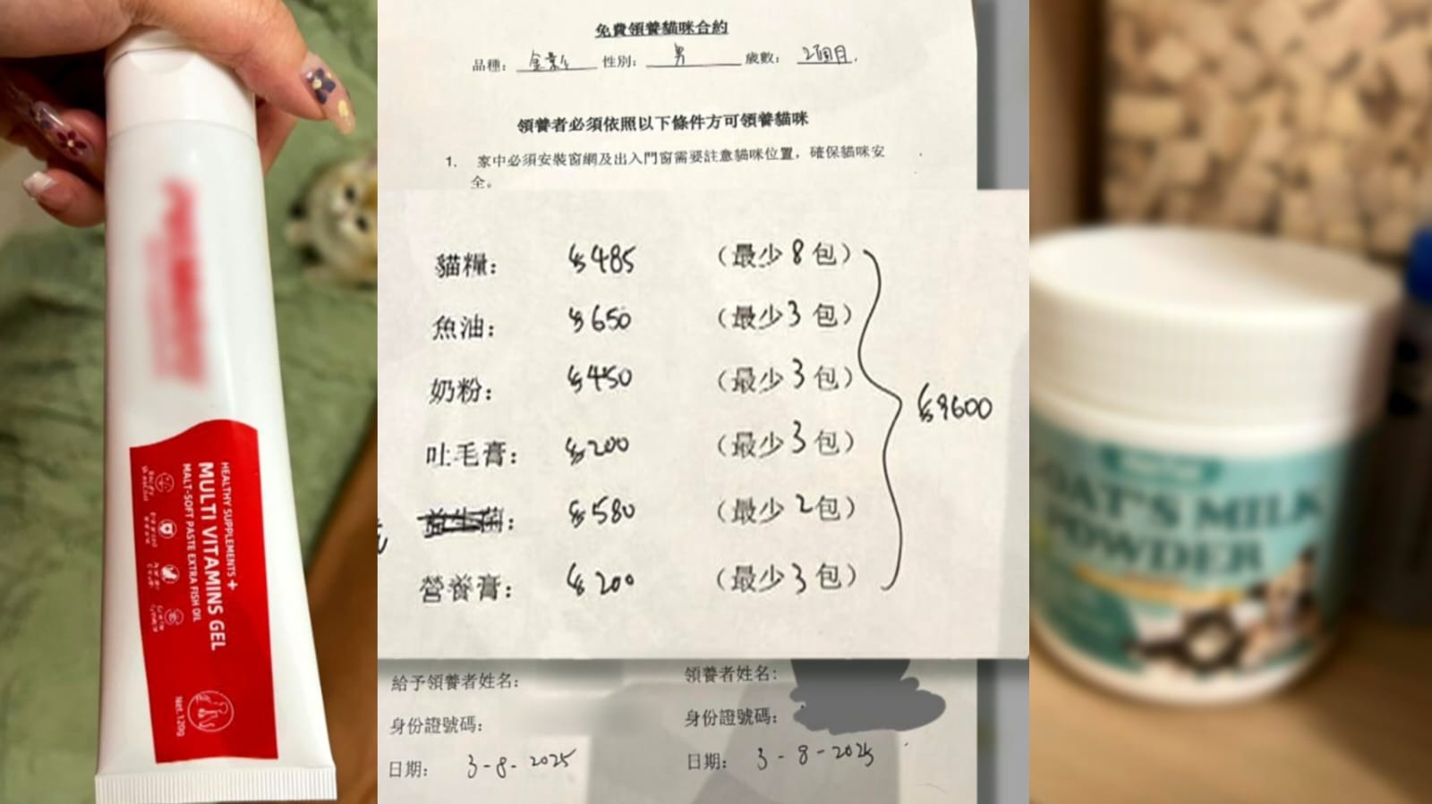 有自稱義工的人約Luna在快餐店見面,一見面就將三隻貓貓丢在Luna身上,然後就要求簽合約,以及付總數9600元買他們提供的貓糧及用品。