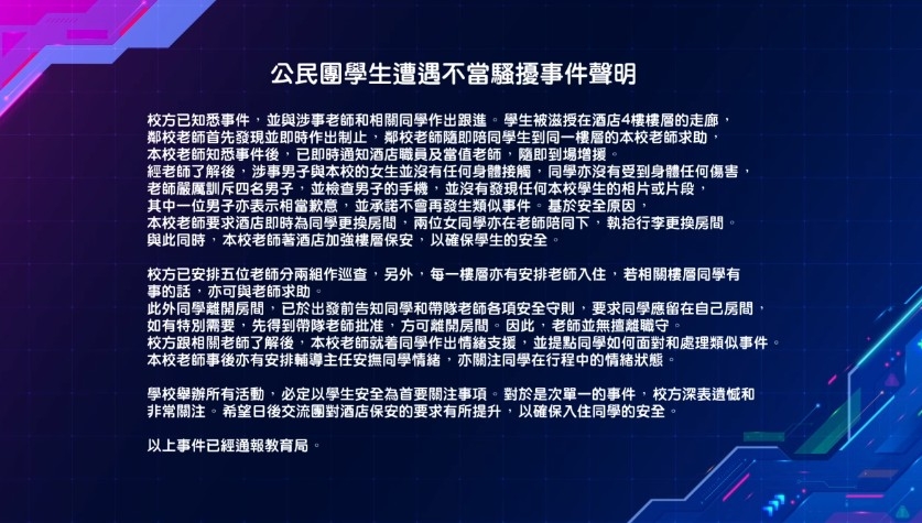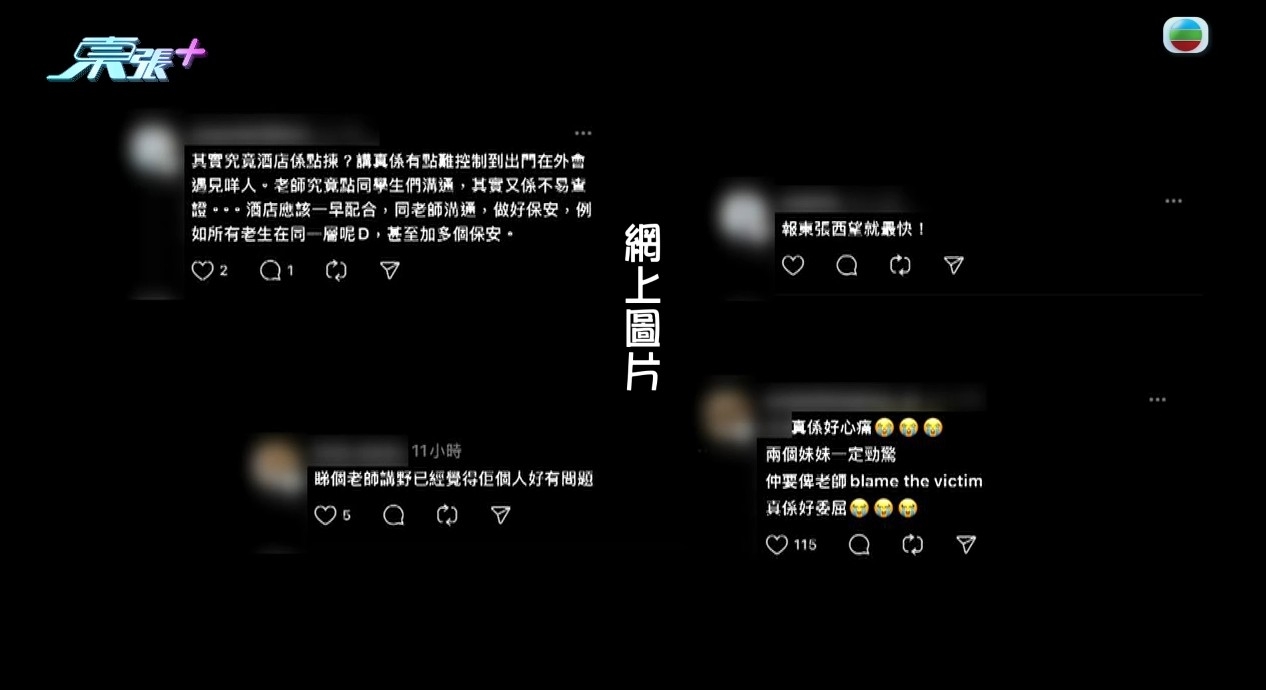 據說,酒店方面隨即為兩名女學生更換房間。但其中一位老師竟然質疑女學生為何要理會那些男子說:「係咪想俾人溝啊?點解你要理佢哋呀?」