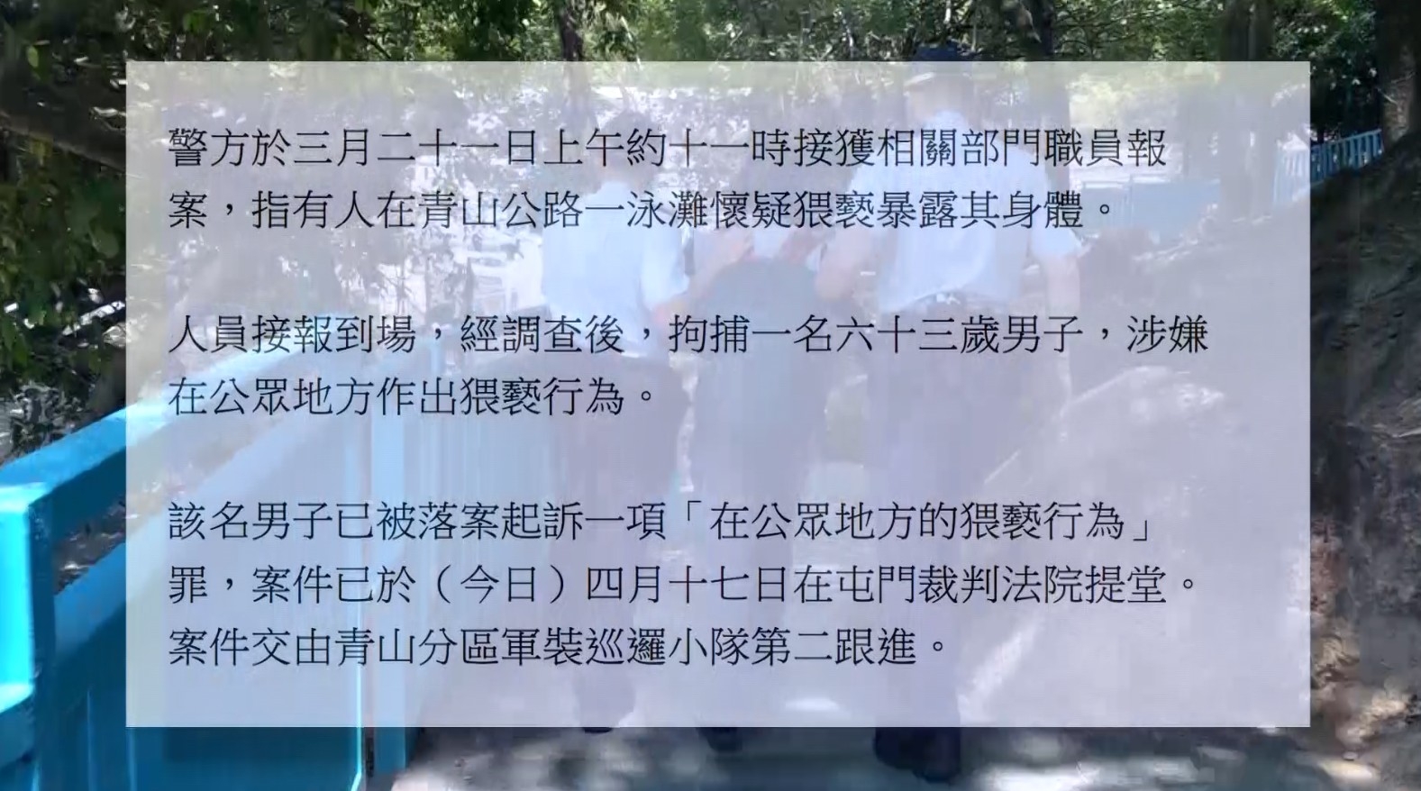 事後警方回覆,警員接報到場經調查後拘捕一名63歲男子涉嫌在公眾地方作出猥褻行為,已被落案起訴,被捕人被判守行為12個月。