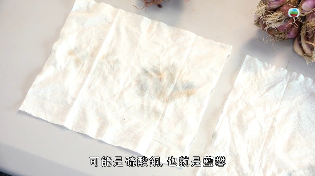 攝製隊向食物安全專家查詢,專家稱可能是硫酸銅,噴在蔬菜上可以起防腐的作用,也可以令蔬菜長期保鮮,不過如果人體過量攝取可能會造成過敏反應。