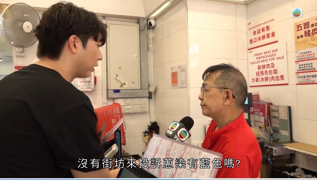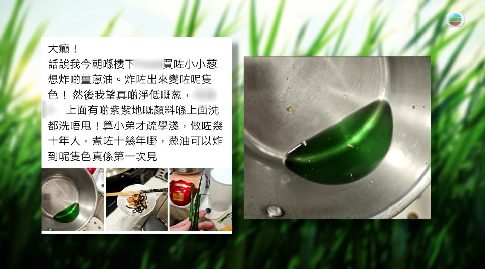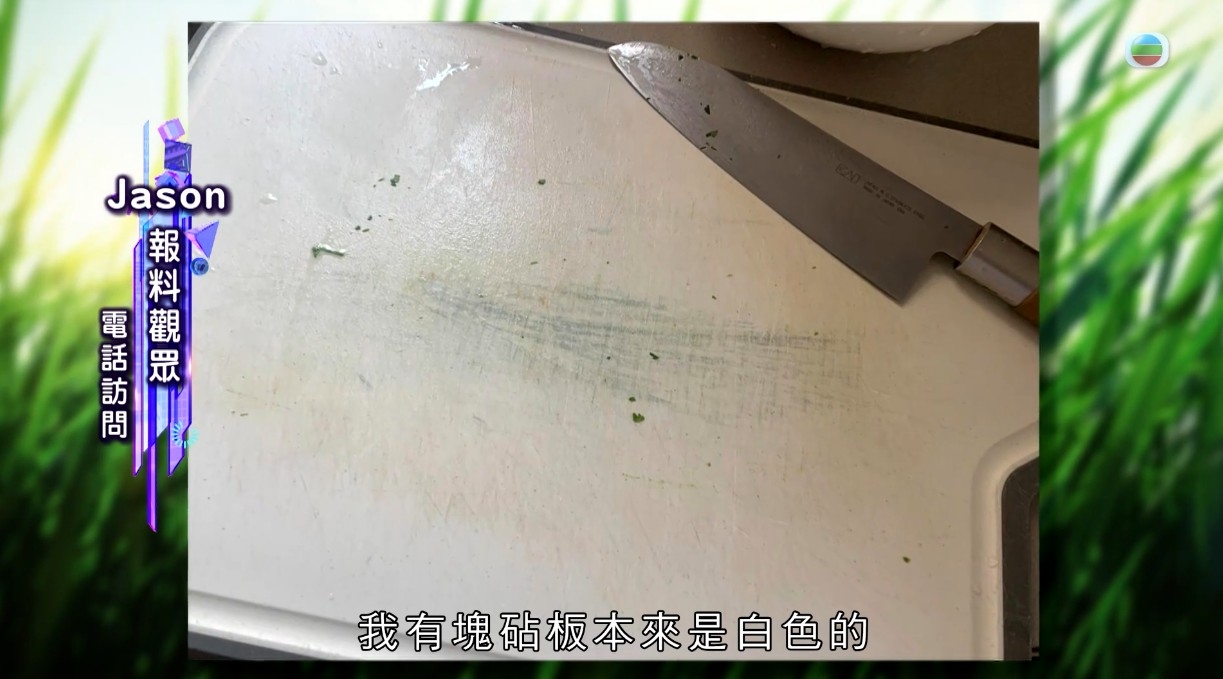 觀眾Jason在北角春秧街買蔥,切蔥後發現竟然滲出藍色液體,白色的砧板都染藍。