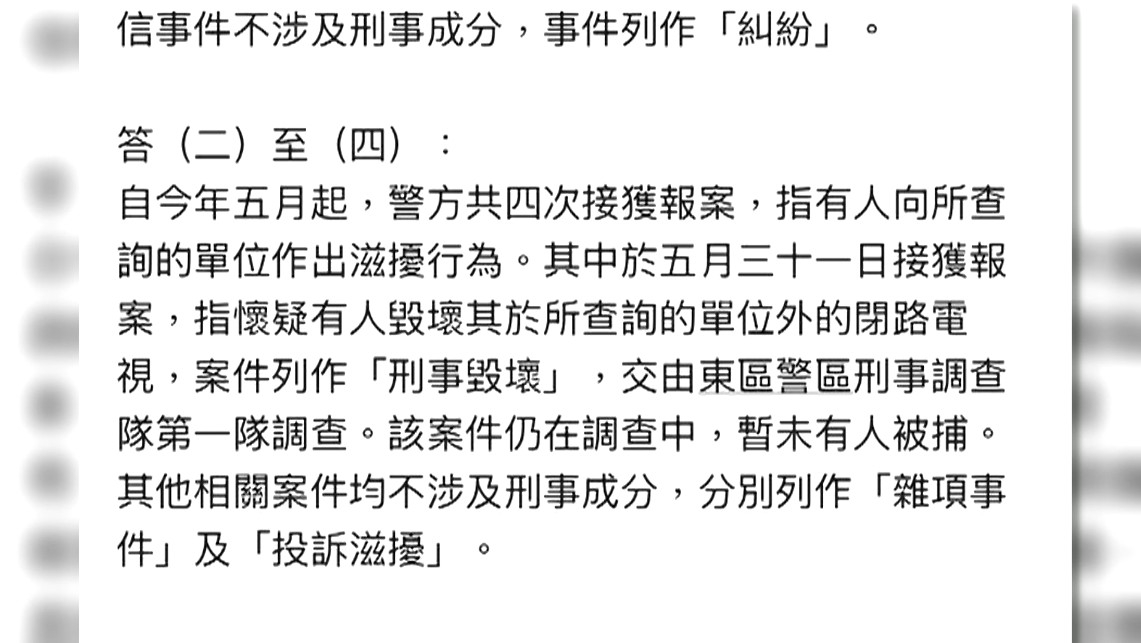 據警方調查,自五月以來,他們已接獲四次報案,指控某單位進行滋擾行為,但警方仍在調查中,一宗涉及刑事毀壞,其餘投訴則未發現涉及刑事成分的情況。
