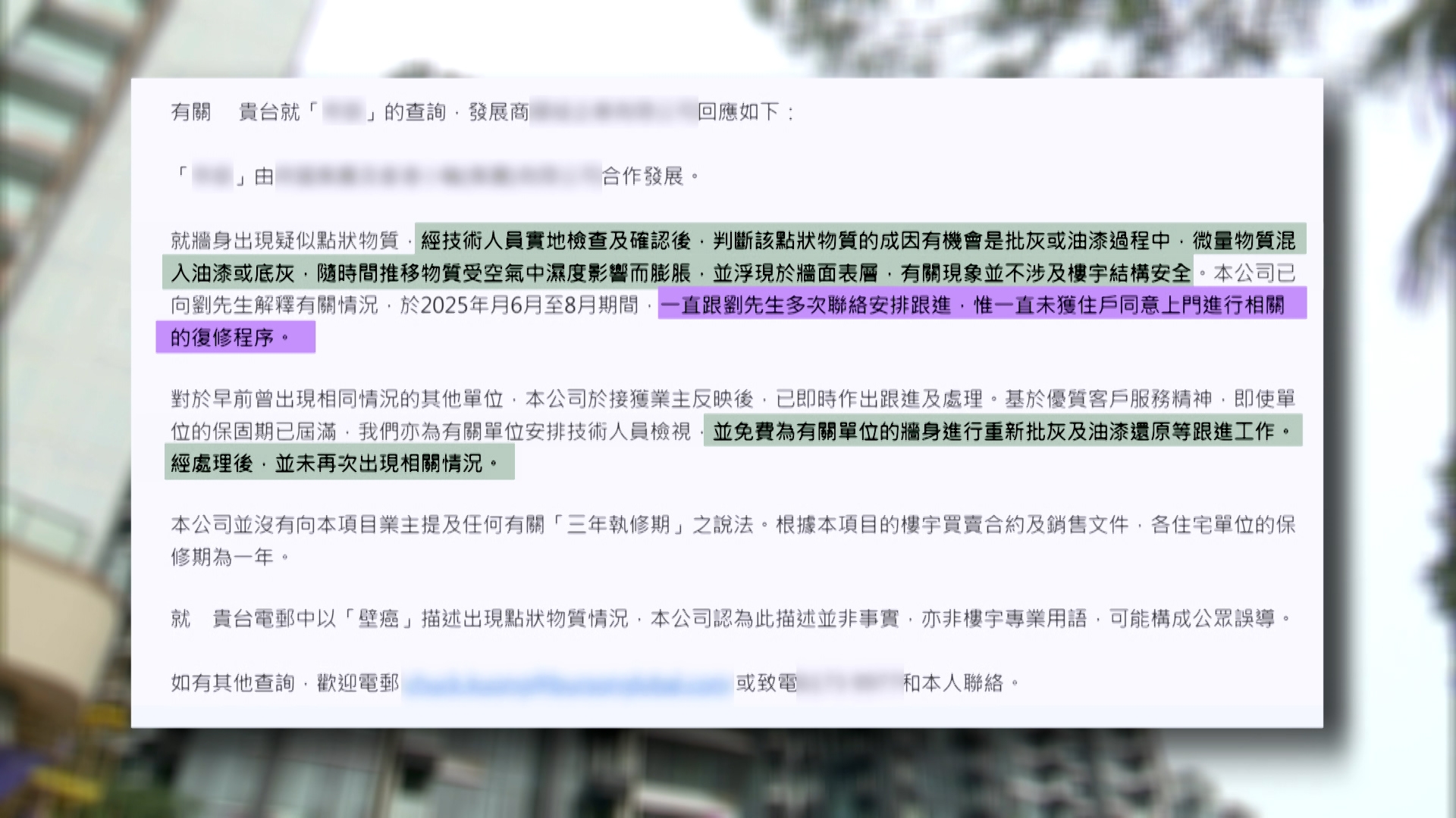 涉事屋苑發展商回覆東張表示:經技術人員實地檢查,判斷牆上的點狀物質,有機會是批灰或油漆過程中,微量物質混入油漆或底灰,之後受濕度影響,膨脹再浮在牆面表層,但並不涉及樓宇結構安全。