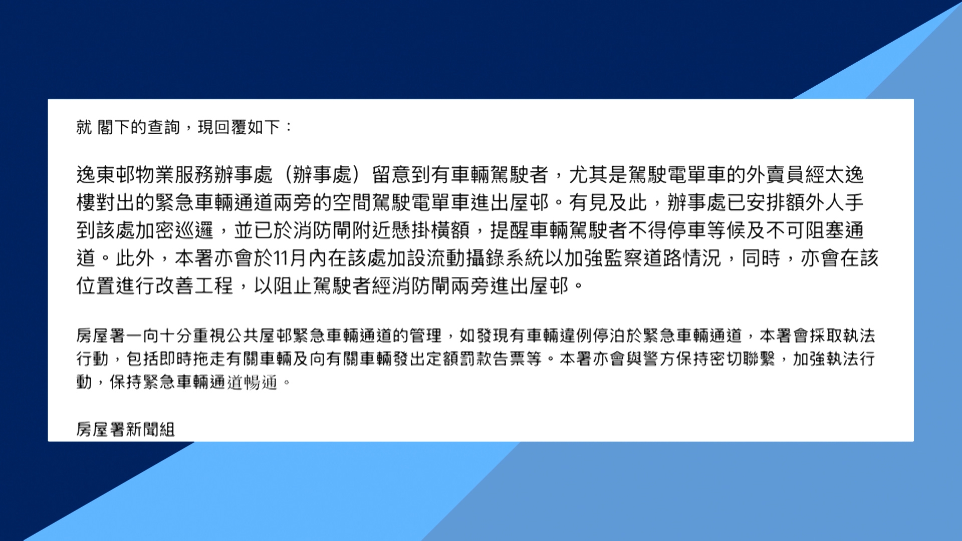 房署回覆東張表示,逸東邨辦事處已留意到事件,已加密巡邏,並在消防閘附近懸掛橫額,將在11月內在該處加設流動攝錄系統加強監察道路情況,及改善工程。