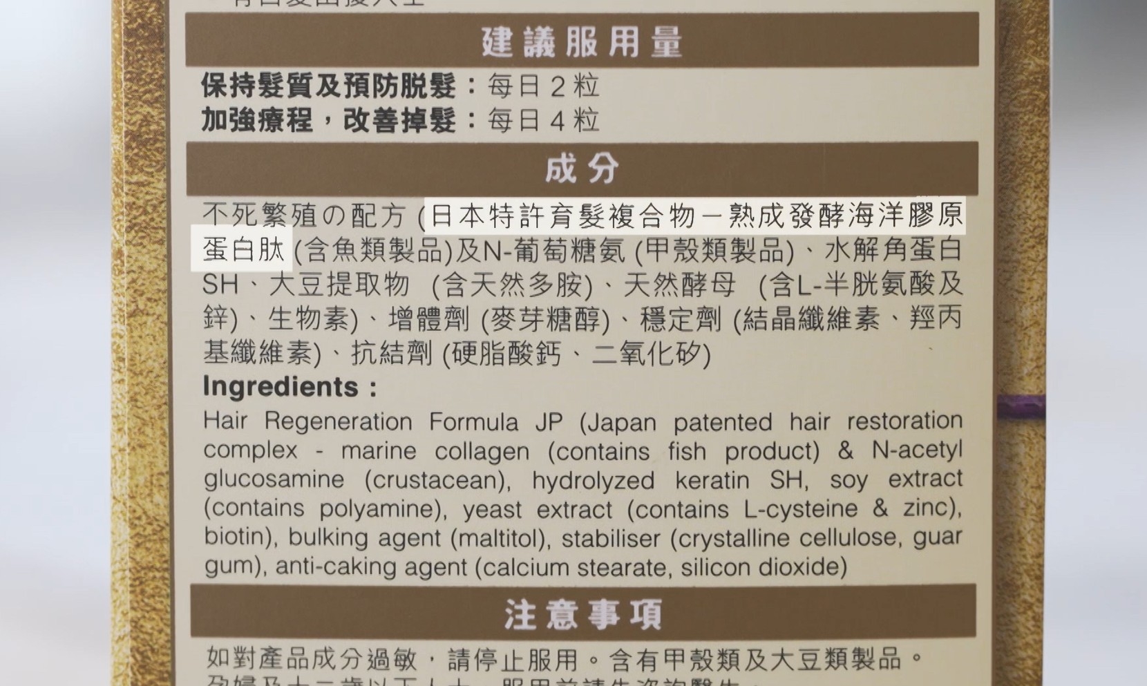 「藥劑師會建議,服用天然無藥性的Supplement,去延長頭髮的生長周期。其實日本科學家發現水母有不死的繁殖能力,研發了「天然多胺」這種成份,能有效激活毛乳頭活性,延長頭髮生長期,幫助頭髮健康生長。再配合日本政府認可專利的海洋膠原蛋白,可以全面激活頭髮健康生長。頭髮變得強韌不易斷,頭髮變濃密,更有助減少白髮情況。」