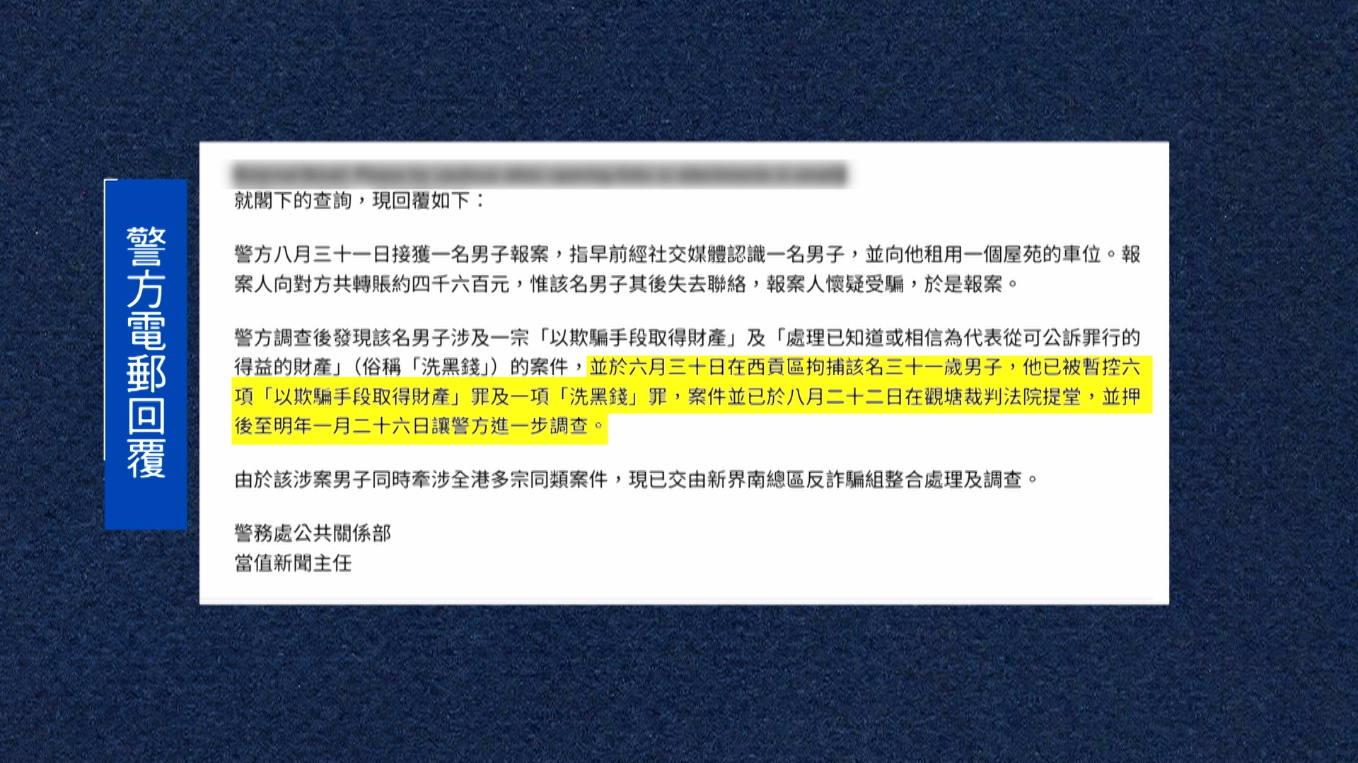 東張就事件向警方查詢,獲回覆指,今年6月已拘捕該名31歲男子,他已被暫控六項「以欺騙手段取得財產」罪及一項「洗黑錢」罪。案件並已於8月22日在觀塘裁判法院提堂,並押後至明年1月26日讓警方進一步步調查。