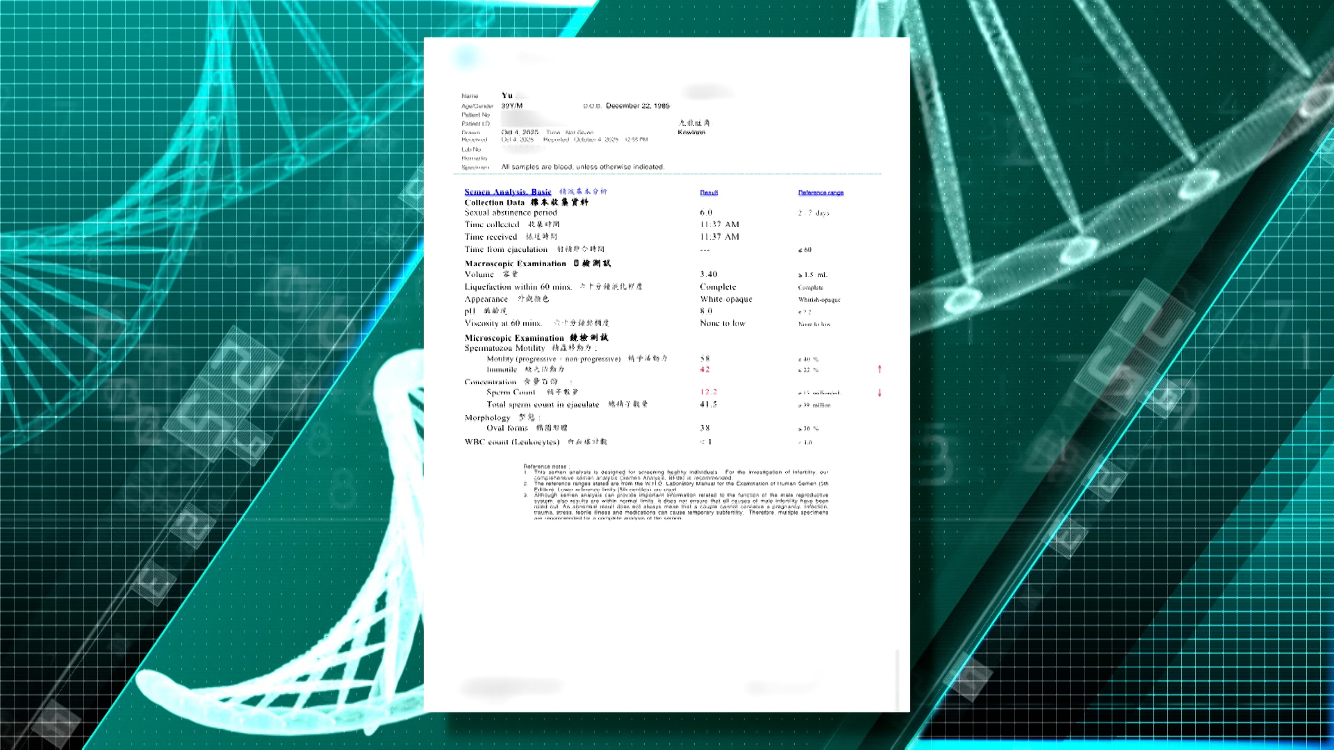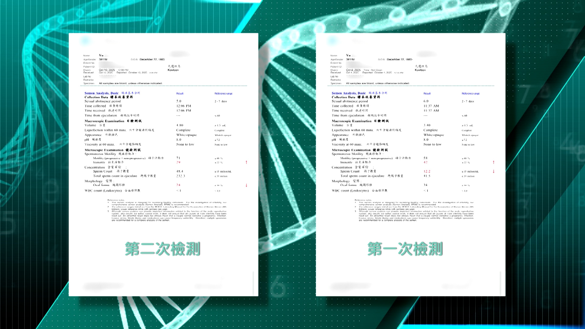 余生自問無煙無酒,身體健康沒有理由精氣不足。於是,他在內地另找兩間醫院驗精,結果出人意料。他在一間三甲醫院驗精結果顯示,精子活躍度遧88.8%,在另一間權威醫院驗精,結果顯示活躍度達86%。但在香港驗精,指活躍度只有42%。