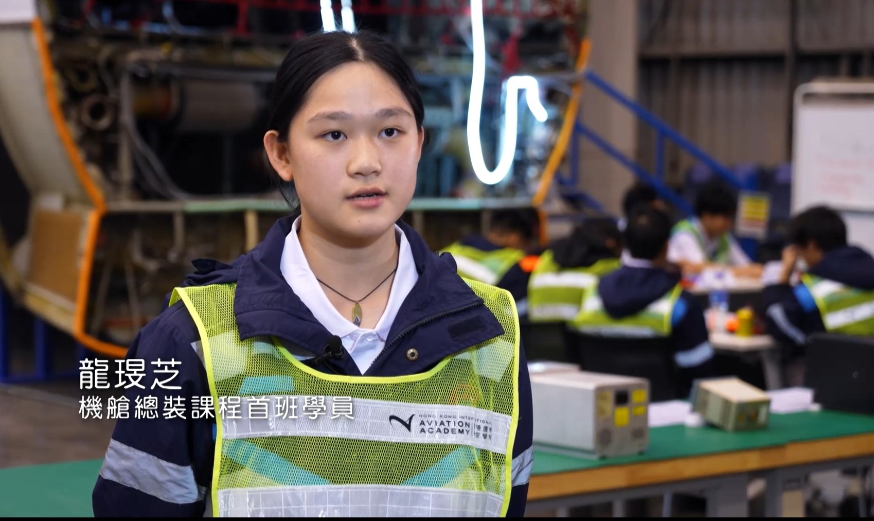 龍琝芝 - 機艙總裝課程首班學員,分享她的學習感受:「在飛機維修公司進行實習,除了理論課外,還可以上到架飛機上面,了解飛機的各種裝置,進一步體驗飛機的真實性。」