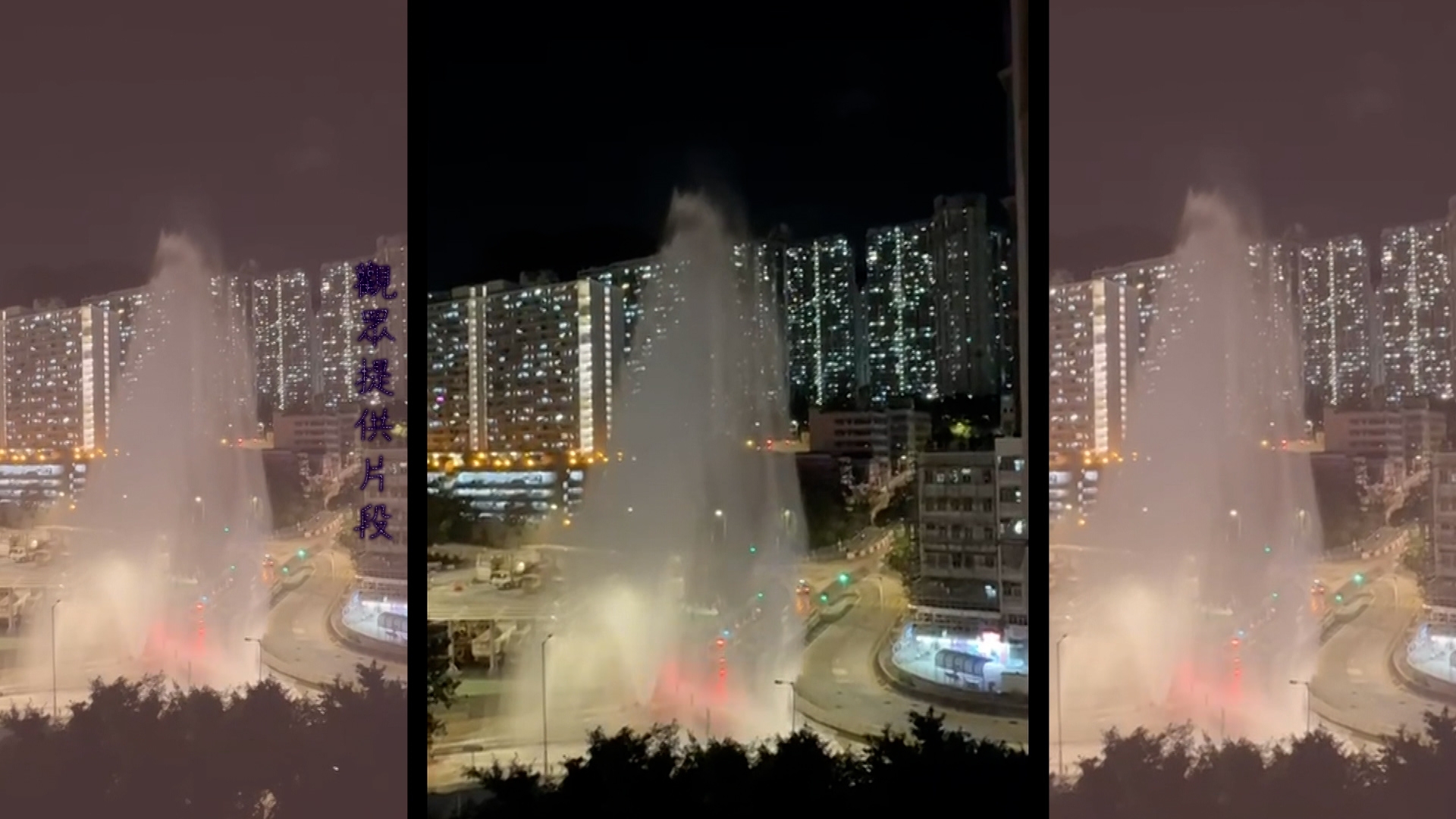 黃大仙沙田坳道昨晚發生嚴重爆水管事故,一條直徑800毫米的鹹水管爆裂,噴出的水柱高達目測10層樓,場面如大型洗車現場令人震驚,觀眾不用去澳門都看到水舞間。