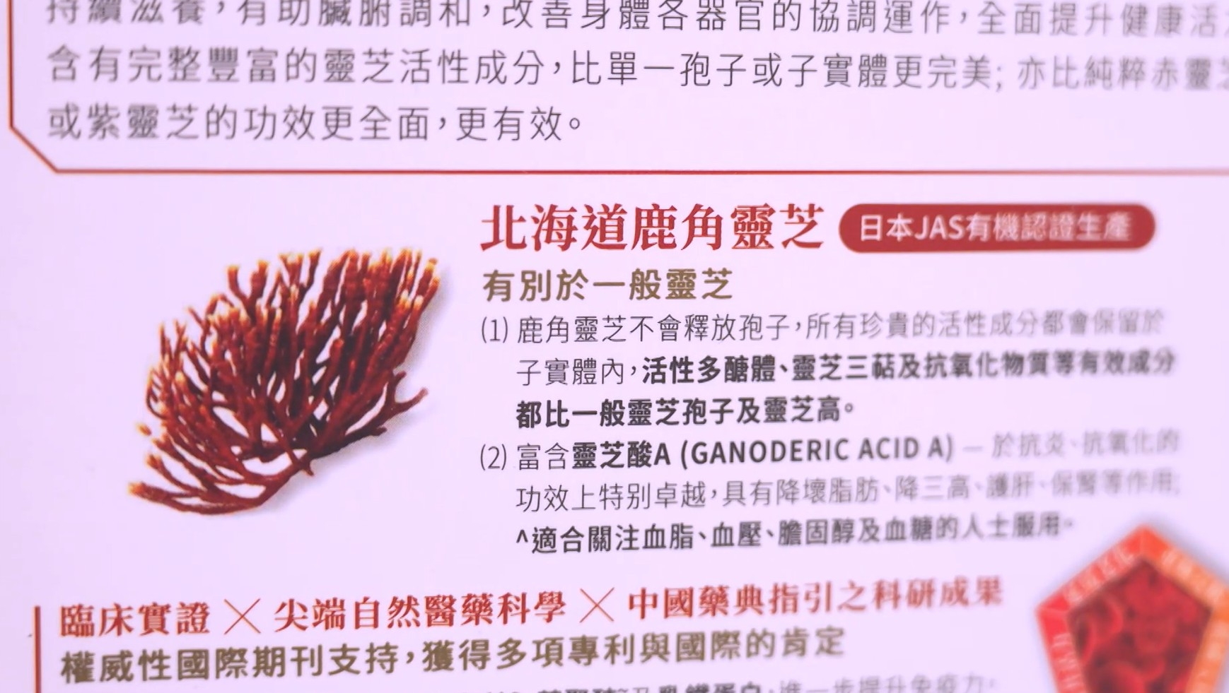 揀選靈芝產品,註冊藥劑師提到:「靈芝其實有好多種,我們藥劑師會建議大家,挑選含北海道鹿角靈芝成分的補充品。因為有日本大學認證測試,證實鹿角靈芝,相較一般靈芝的活性靈芝酸A含量多28倍 ;而活性多醣體含量更多出55倍。