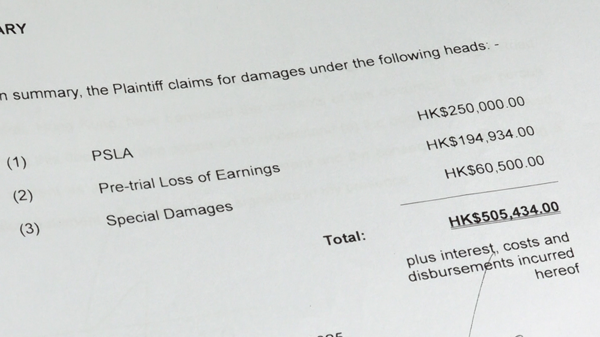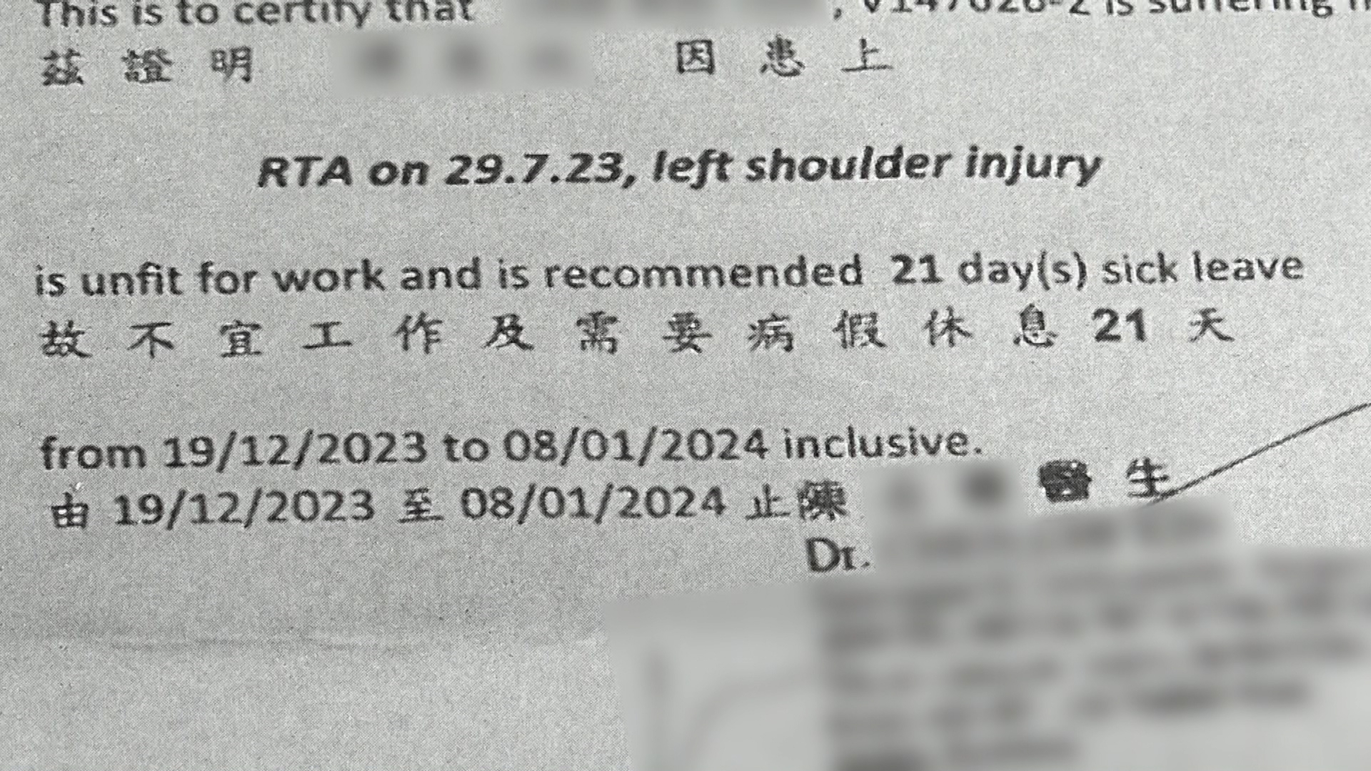 阿John事後被警方檢控不小心駕駛,在2024年7月案件完結,他被罰1500元並扣分。他被判罰不久,在2024年8月底,他突然收到對方律師信,當中包括大量醫療收據、病假紙和看跌打單據。還有物理治療和西醫骨醫等醫療紀錄。單據顯示,對方因左肩受傷放病假半年,另有許多高價診金。