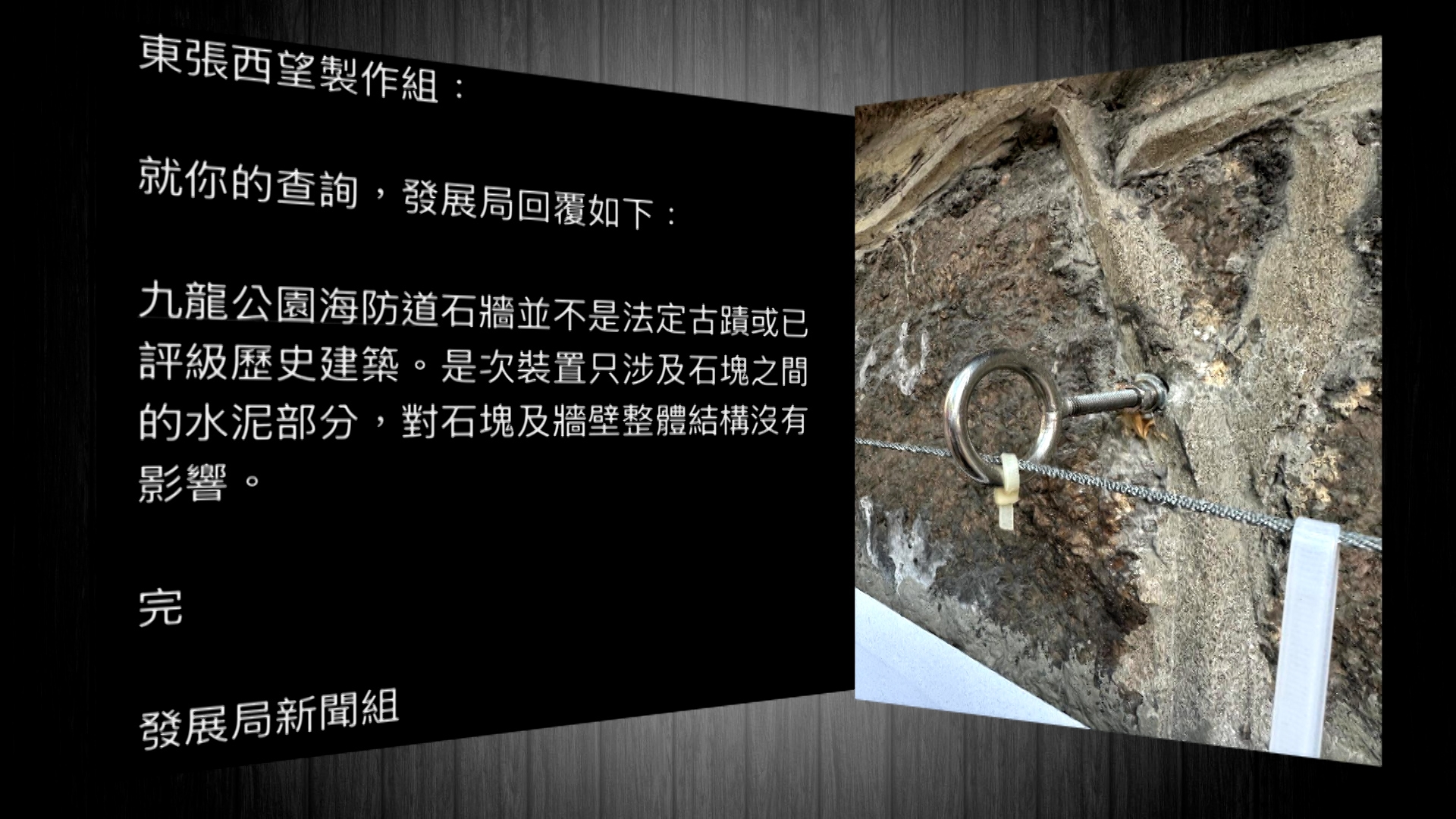而發展局回覆東張指,海防道石牆並不是法定古蹟或已評級歷史建築。是次裝置只涉及石塊之間的水泥部份,不影響石牆結構。