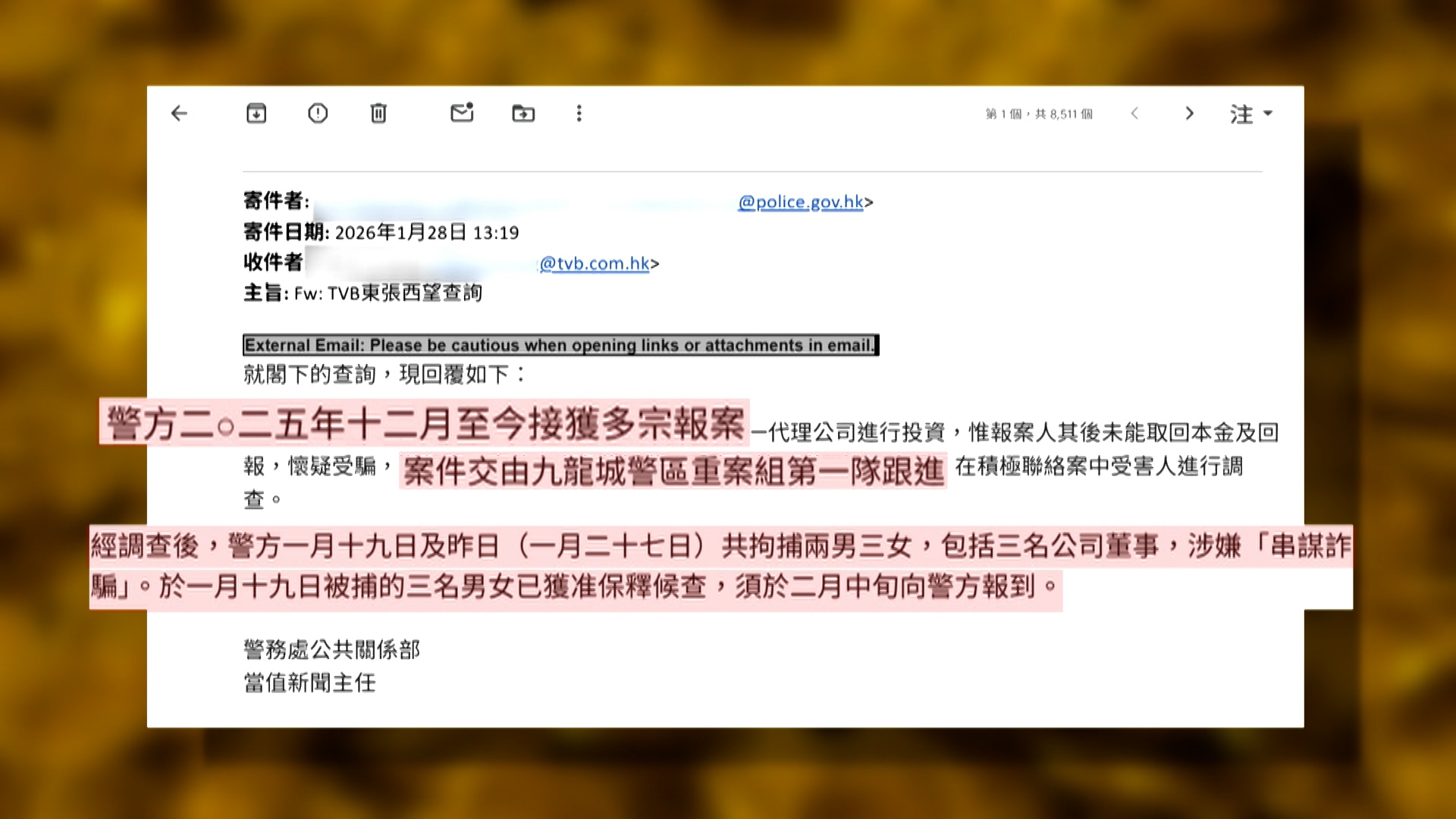 警方回應東張表示,2025年13月至今接獲多宗報案,今年1月19日和27日,先後拘捕兩男三女,包括三名公司董事,涉嫌「串謀詐騙」,已獲准保釋候查。
