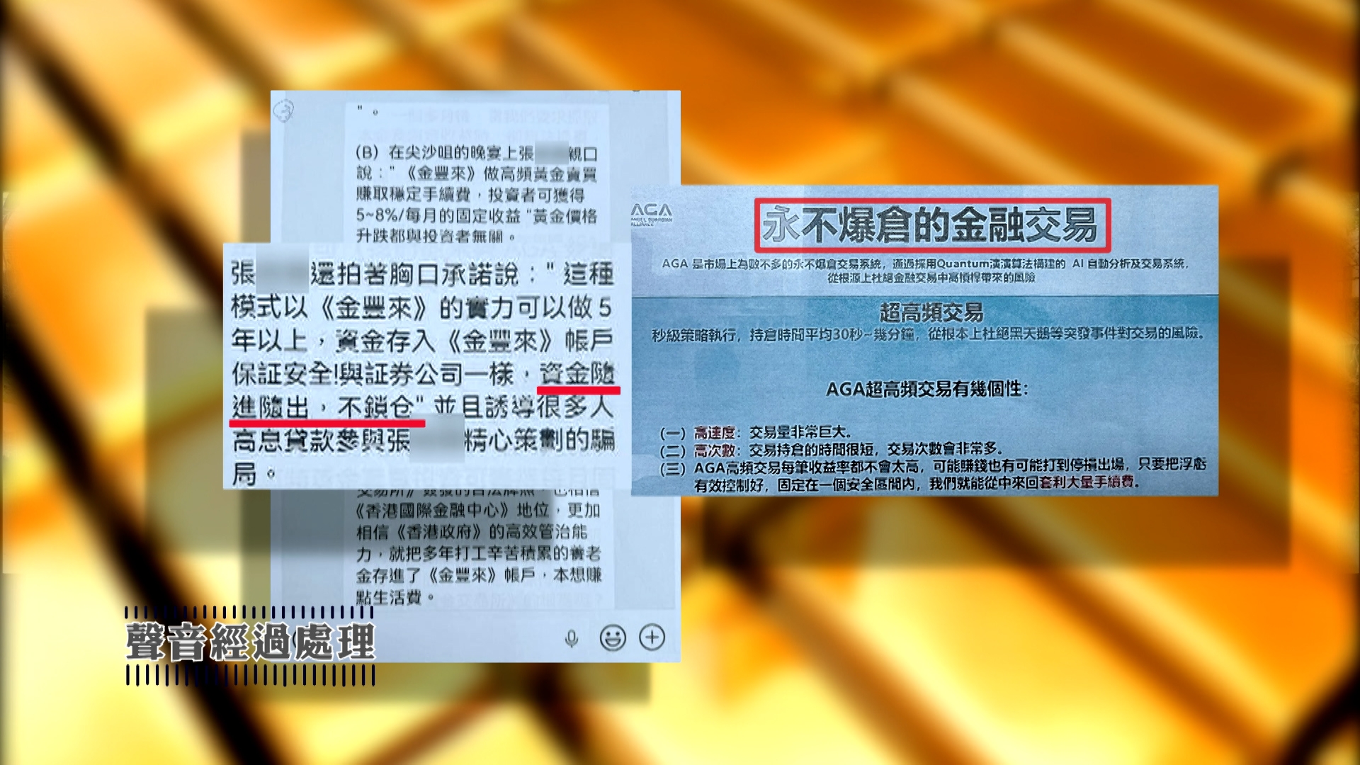 一名女苦主稱,投資的錢查看帳目有賺,但沒有提出,因為被告知滾存下去可以賺更多。但她最終看帳目賺了100多萬,最後只是數字,「一毫子都拿唔返」。黃金卷商聲稱與一個平台合作,以AI程式,標榜引領智能金融新時代。不過,這個AGA平台上的公司高層圖片,明顯看得出也是AI生成。