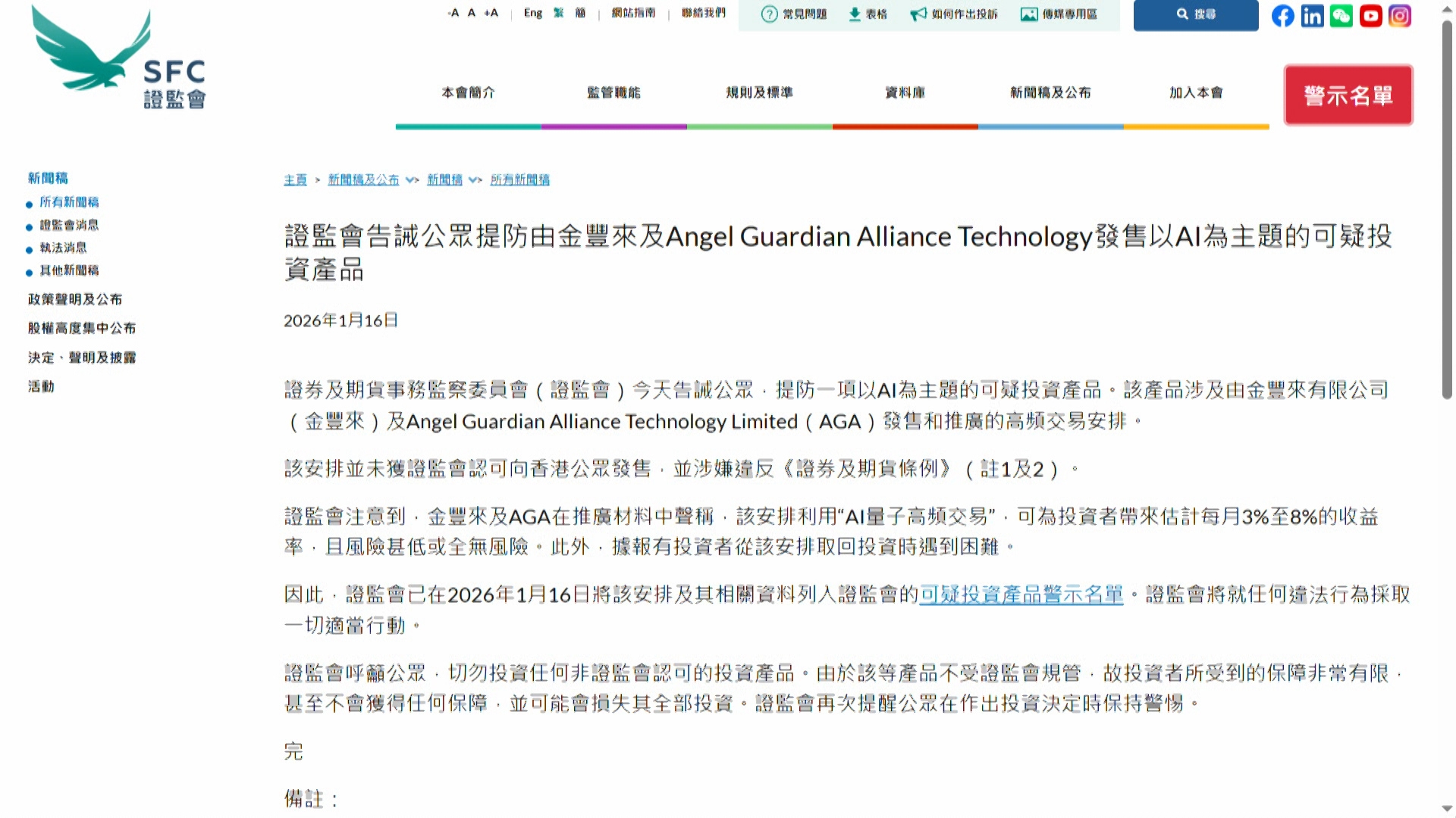 拍攝當晚,證監會發出新聞稿,告誡市民提防「金豐來」和AGA兩間公司,涉發售以AI為主題的可疑投資產品。
