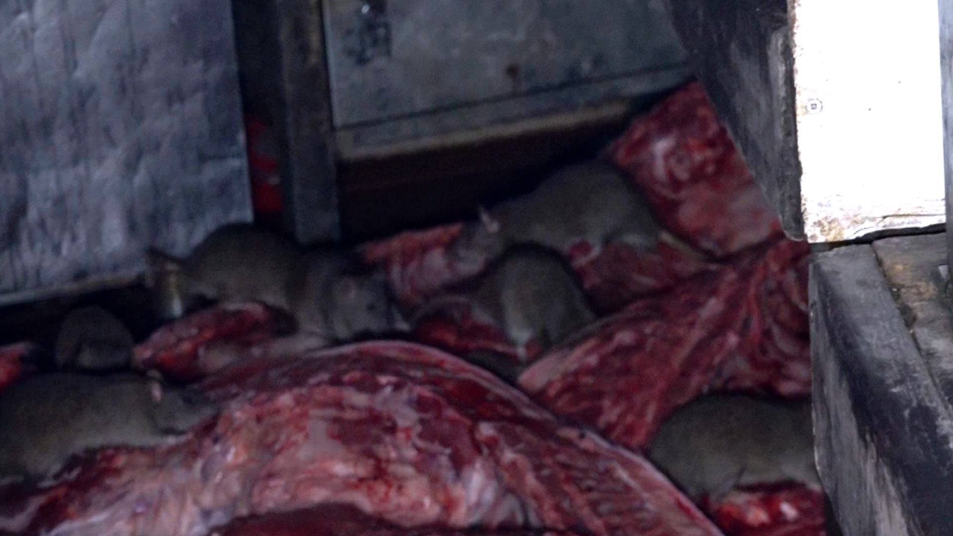 不過,東張在對上兩個月的追蹤期間 ,仍然見到兩間肉檔如常拖拉豬隻。還拍到大量老鼠吃豬肉的畫面。![]()