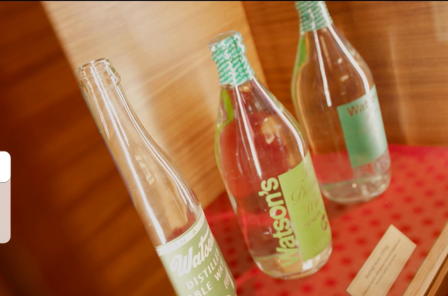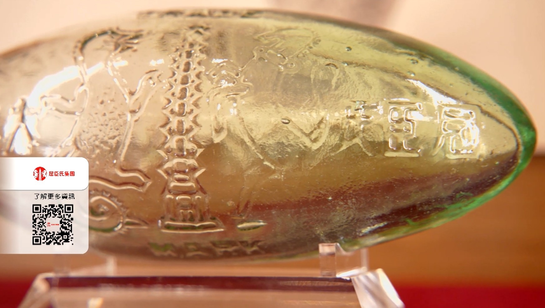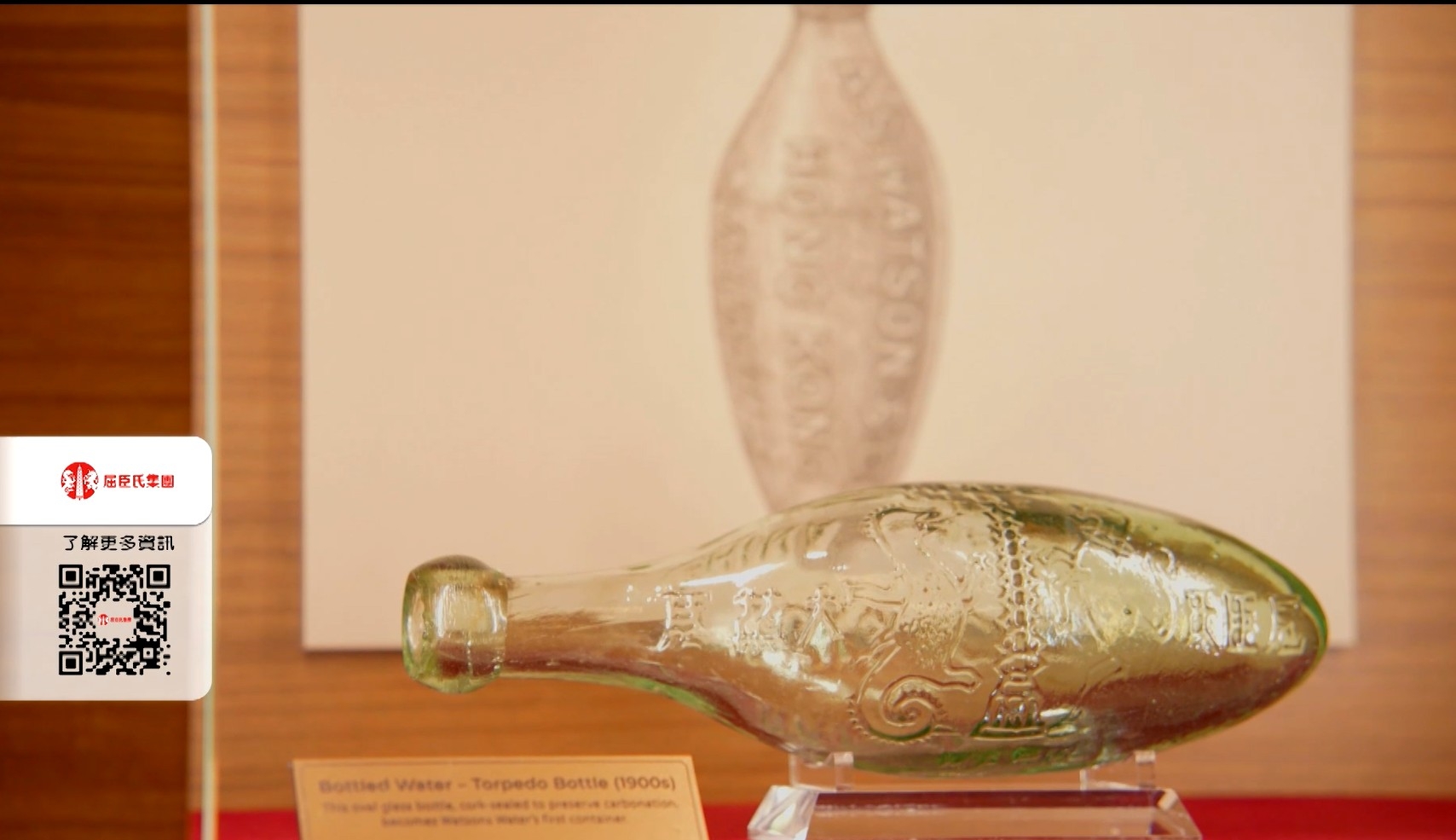 這個玻璃樽好像魚雷!屈臣氏集團行政總裁倪文玲博士稱:「原來這個是獨特的水樽設計,底部是尖的,吊起是防止鋪塵及蟲入到水裡面。當年衛生情況不是太好,缺少乾淨的飲用水。於是,我們就在1903年推出蒸餾水,之後,更引入了『荷蘭水』添!」