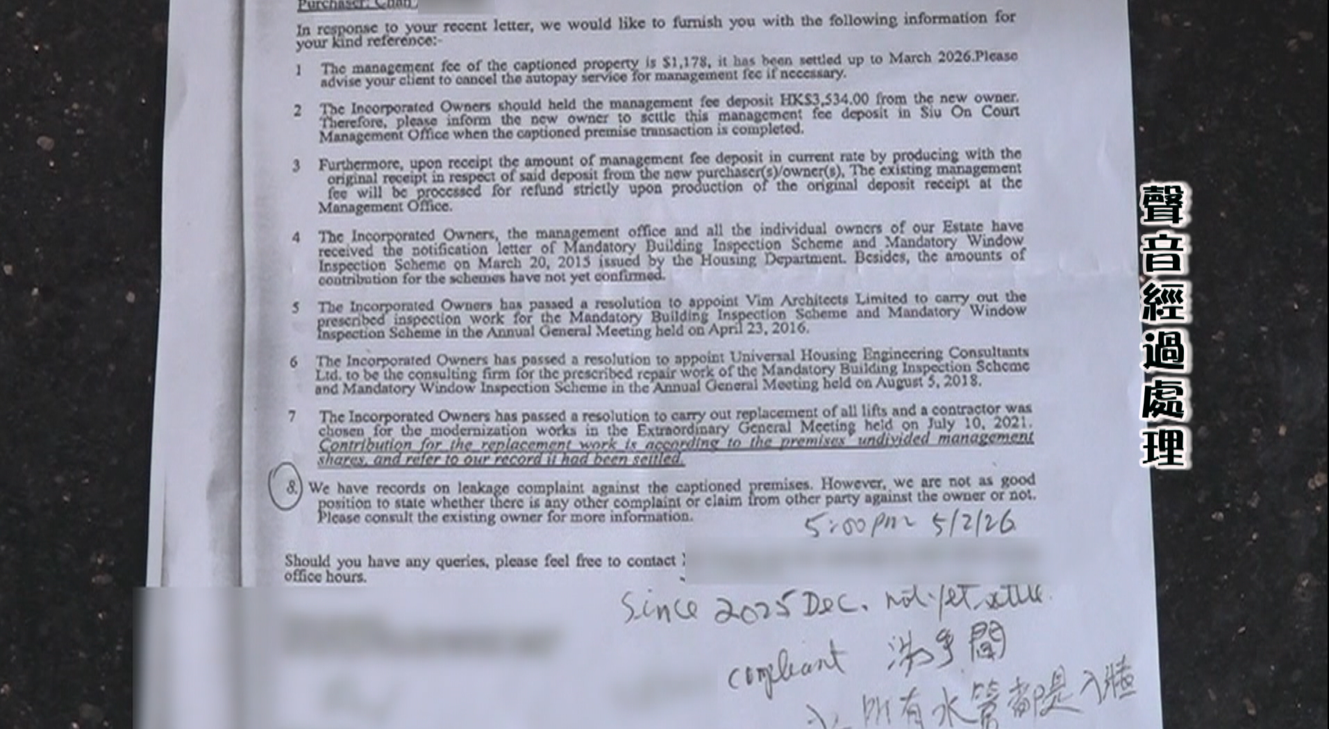 陳先生因此多次向地產代理查詢,而且覺得賣方其實根本沒有進行維修,只是搬出單位後暫時沒人用水,之後把該單位賣給陳先生。目前陳先生已聯絡不到業主,只能透過中介聨絡。陳先生表示,賣方在合約內從未提過漏水或維修情況,但有一份聲明提到,如果賣方收到樓下通知需要維修,便要告知大家,並在聲明上簽名,但很明顯賣方沒有履行這個責任,也沒告訴陳先生有維修情況,認為自己已經處理便了事,很明顯想隱瞞這個情況,不讓陳先生知道。另外,其實經紀也應該要盡責,也沒有應客戶要求詳細解釋該單位有滲水的歷史紀錄。