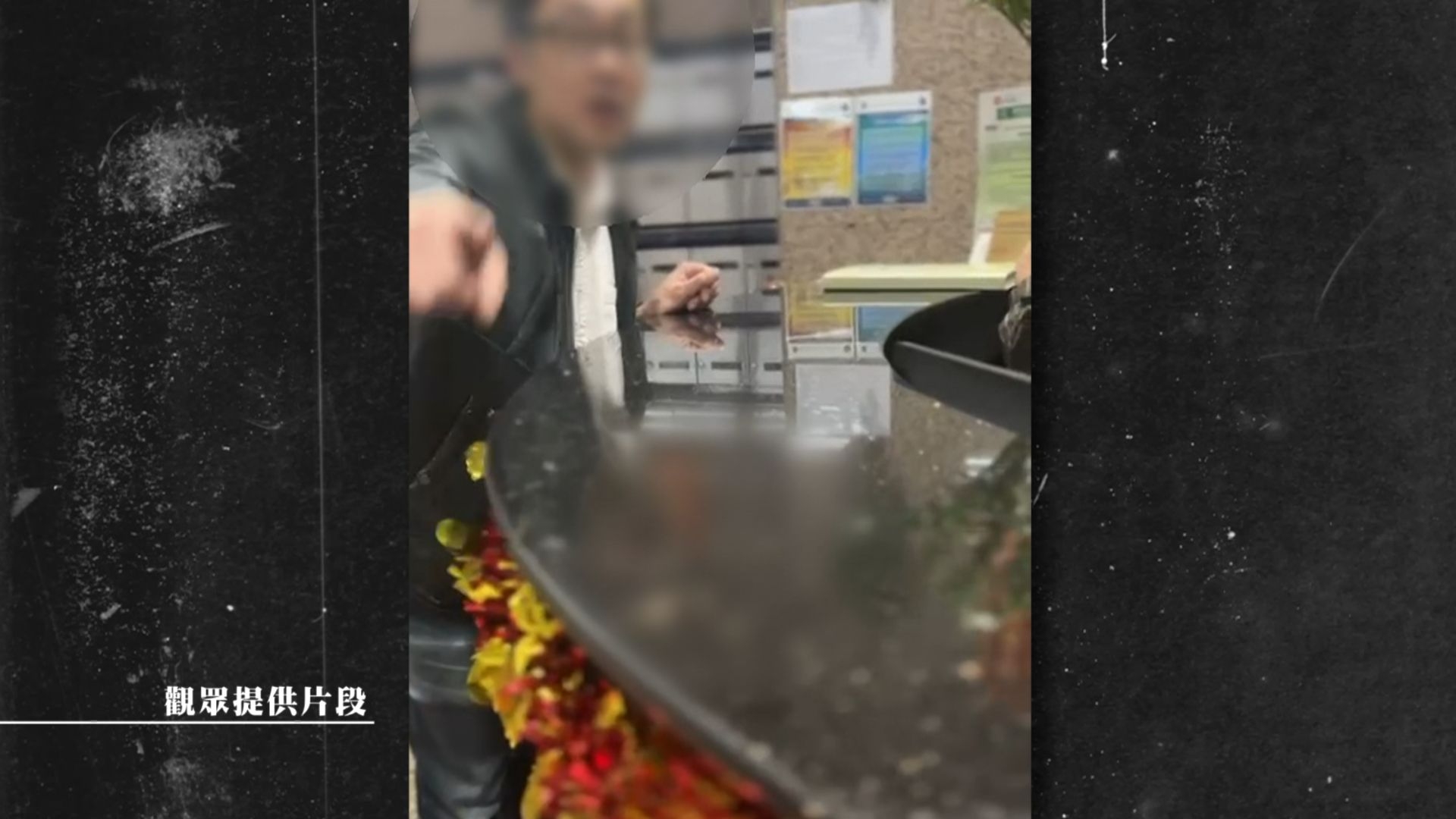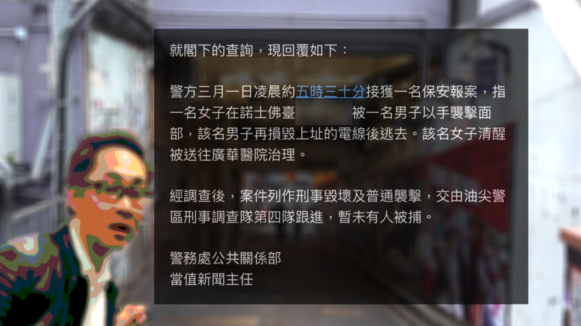 Angel指,涉事男子搭另一電梯下來後,開始發瘋。管理處職員要求他拿身份證登記,但他拒絕。他更發惡打傷女事主和看更,並且破壞管理處CCTV電腦後逃離現場。數分鐘後警察到場,向Angel落口供,但至今未能拘捕涉事男子。