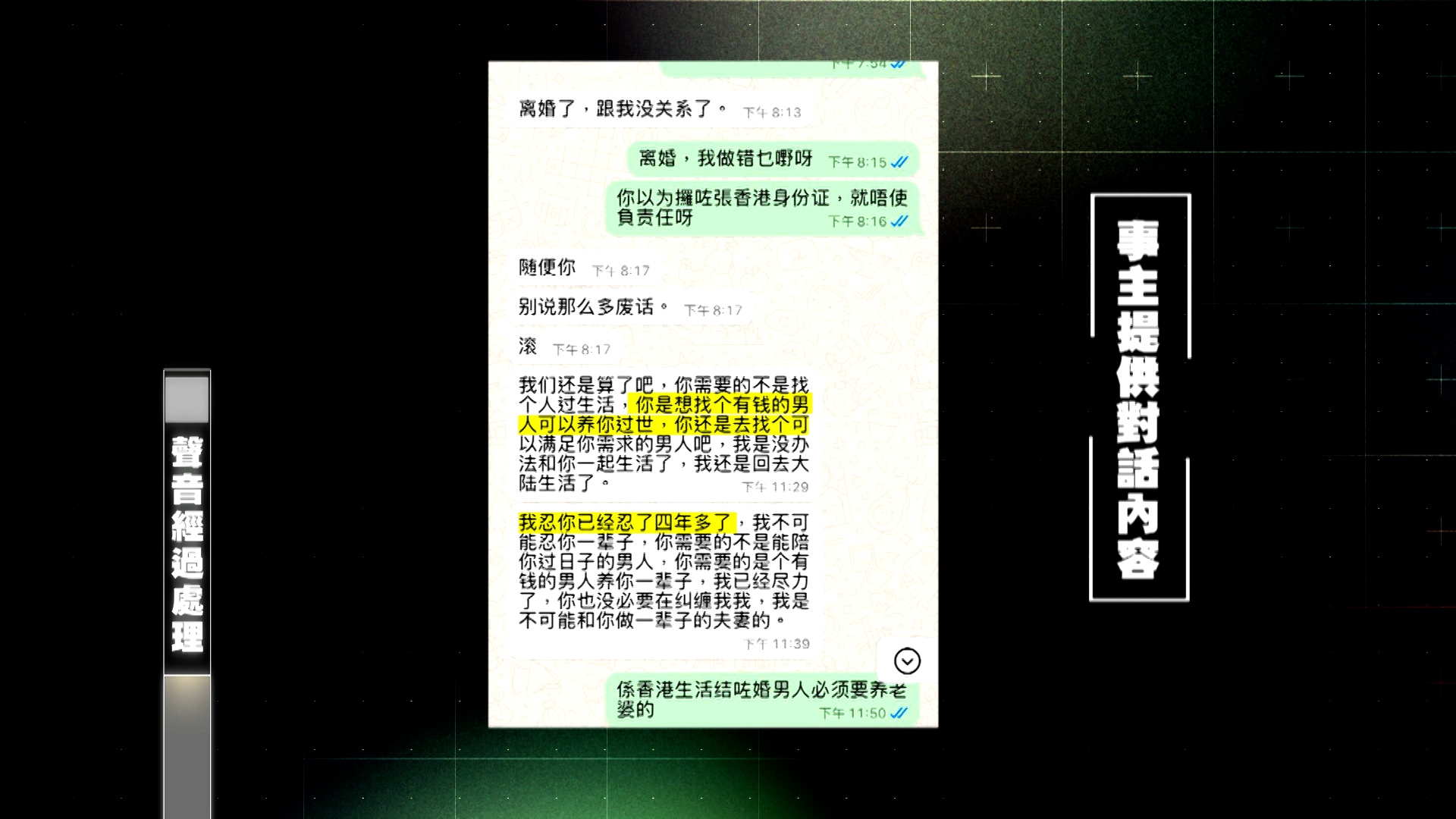 阿娥微信阿成,對方要求離婚,聲稱忍咗阿娥4年。