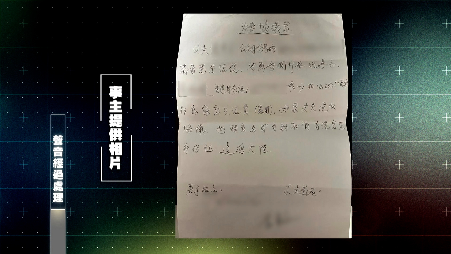 2024年,阿成要求申請來港,並聲稱會照顧妻兒。阿成又寫下夫妻協議書,答應來港後每月給10000元家用。