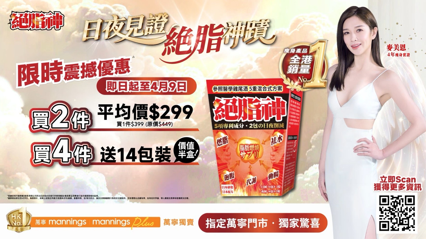 全城熱話!「絕脂神」即日起至4 月9 日,全線萬寧推出限時激抵優惠!買兩盒平均低至$299 ,低至67折!想再抵些?買四盒即送14包裝贈品,足足有半盒咁多!