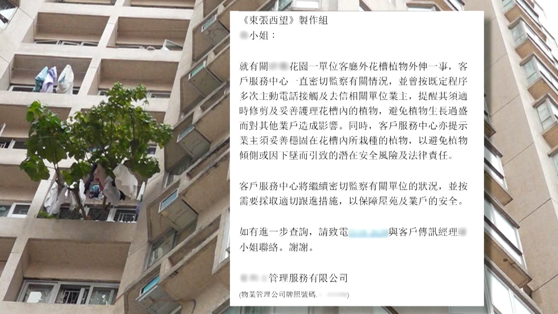東張就事件向大廈管理公司查詢,回覆指,已多次聯絡上址業主提醒應適時修剪花槽內植物,及妥善穩固,避免引致潛在安全風險。