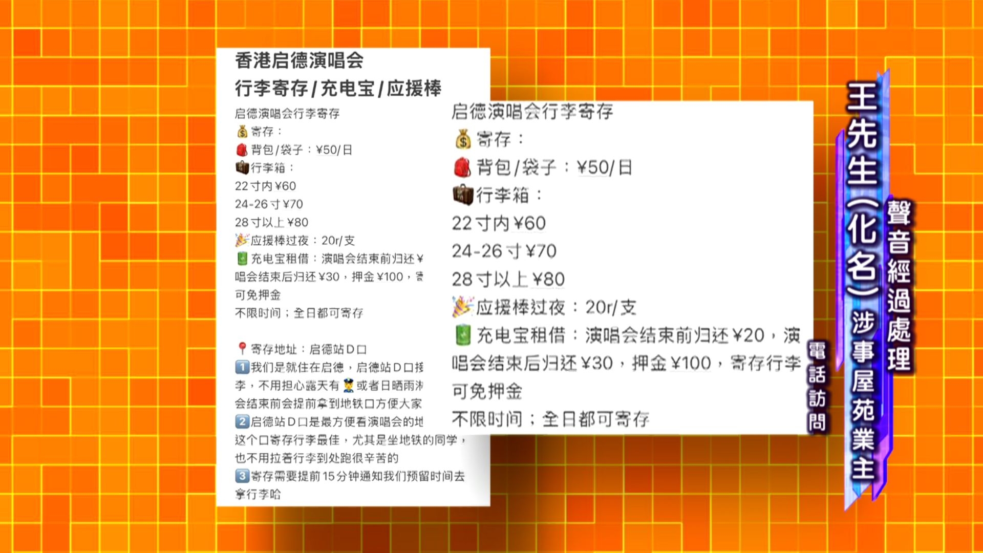 王先生向東張主持梁菁琳表示,近日五月天演唱會期間,屋苑大閘外更擺放了約30個行李箱,存放和領取的人來來回回,令鄰居備受騷擾。