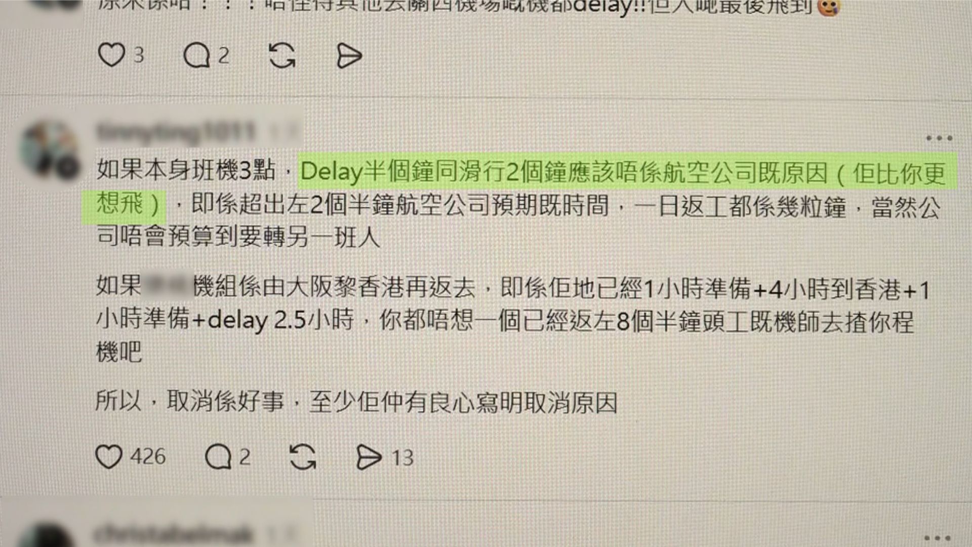 同機乘客在網上分享今次不愉快經歷,不滿機組人員因超時工作取消航班,但也有人認為取消是好事。