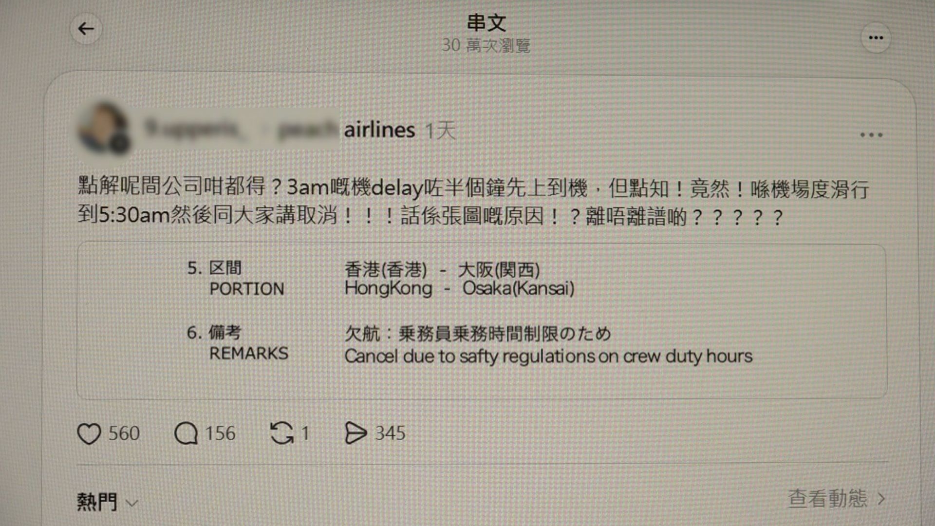 葉生向東張主持黎寬怡表示,航班原定昨日凌晨3點從香港飛大阪,但延誤到3點15分才開始登機,之後多次延誤未能起飛,到清晨5點半飛機才開始移動,但再過半小時仍未起飛。機長最終宣布航班需要取消。