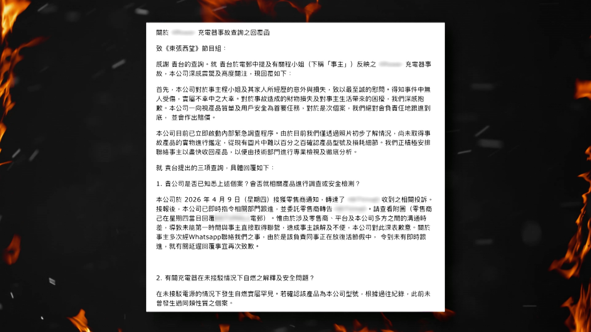就事件,東張向涉事充電寶品牌維修中心查詢,品牌負責人在電話中向東張主持表示,將聯絡客戶了解情況。程小姐事後表示,已獲品牌方積極跟進及商討賠償。充電寶品牌也回覆東張表示,對事件高度關注,絕對會負責及跟進到底。