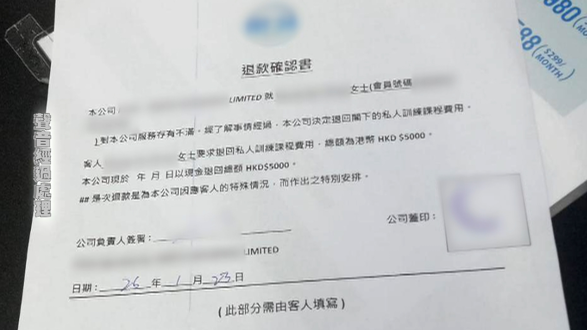 Kitty冷靜後想取消合約及退錢,但教練稱需要找總監,但在簽署不得追討的承諾書後僅退回5千元,且中心表示退款後仍有30堂課堂可上。