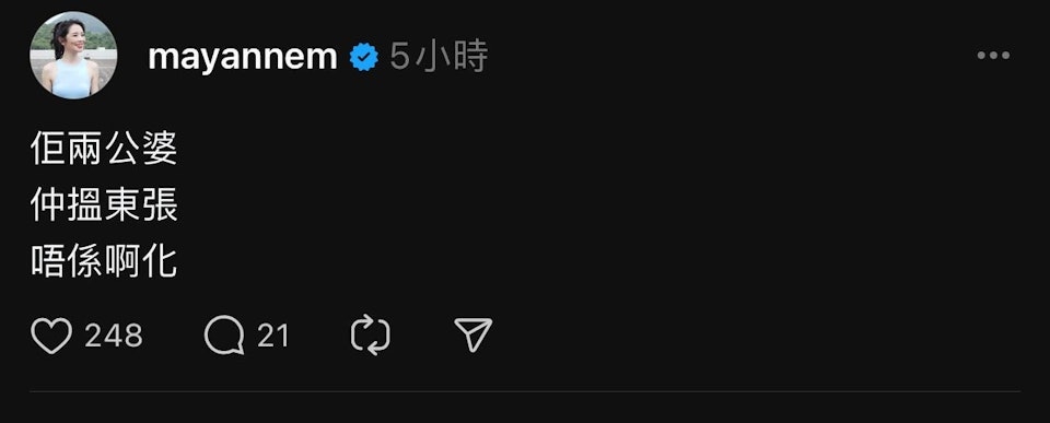 此外,最佳女主持麥美恩突然也在社交平台有感而發寫上:「佢兩公婆,仲搵東張,唔係啊化?」看似不太認同二人的言論噃。