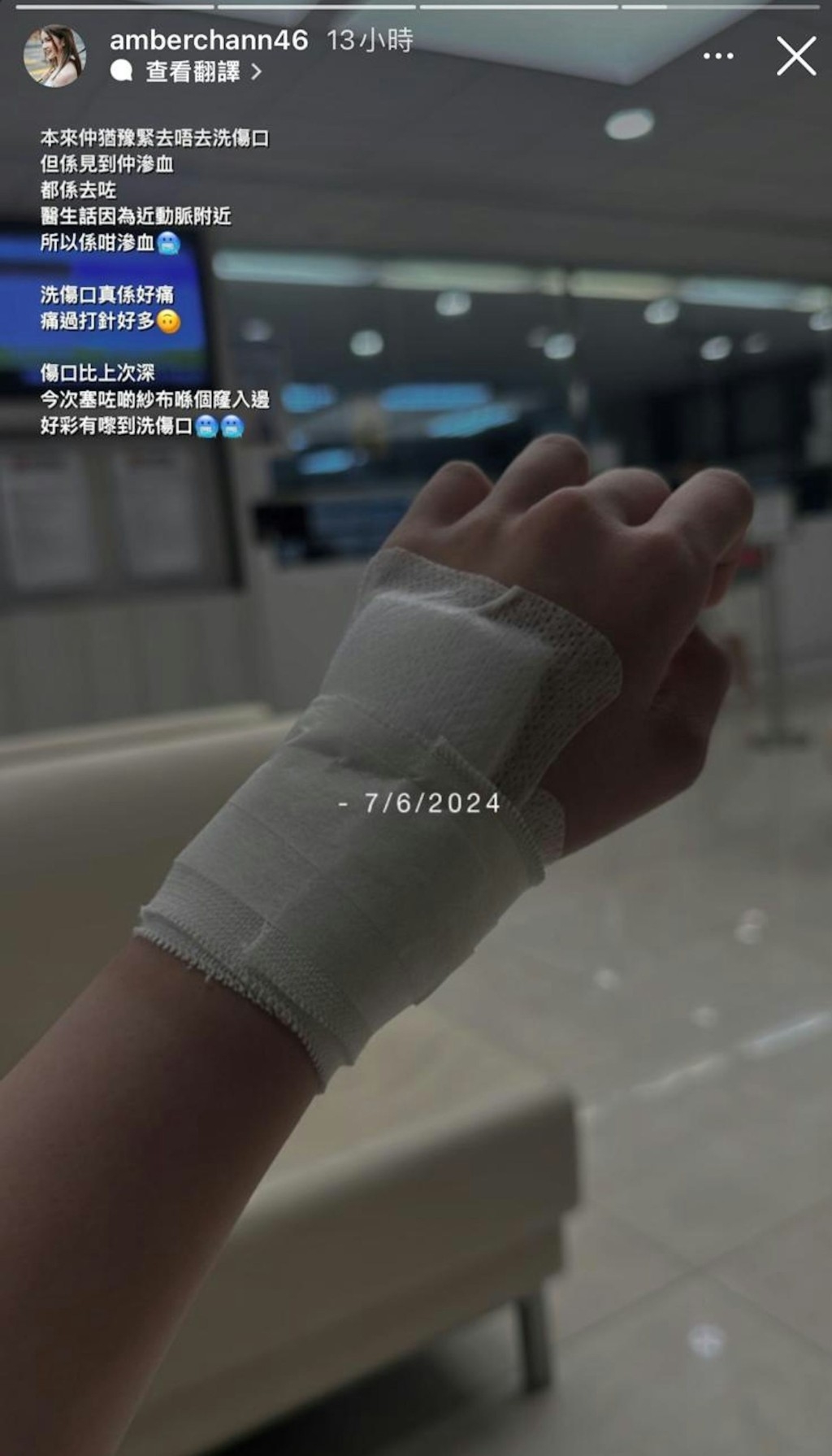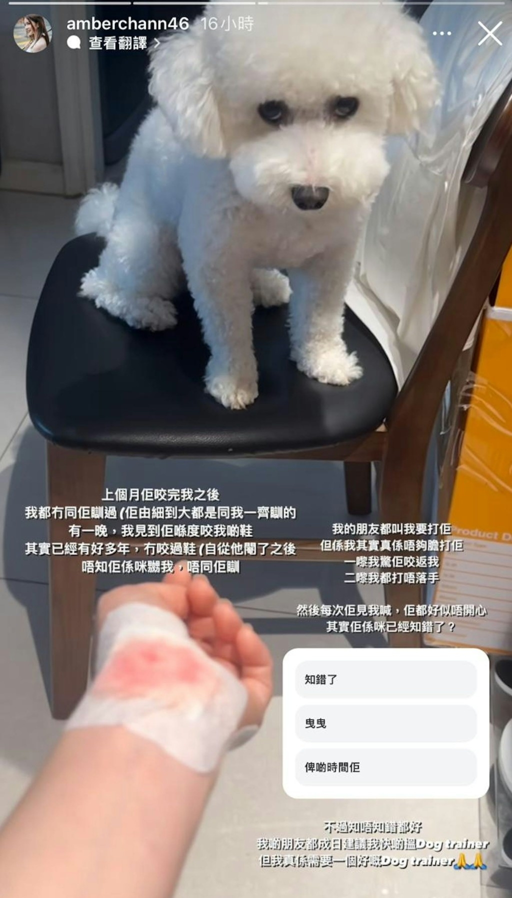 陳若思日前在社交平台上載多張相片,見到她一雙白滑美腿前方,卻驚嚇有一灘血漬,腳上更踏着一張染血紙巾!她文中寫上:「好心灰,我係一個唔好嘅主人,唔識得教狗,上個月俾乖乖咬完一次,今個月又俾佢咬,我需要一個好嘅dog trainer,求推薦,護食問題嚴重。」原來狗主陳若思屢次被雄性比熊愛犬「乖乖」咬傷,今次傷口還不斷滲血,醫生指因為傷口近大動脈。