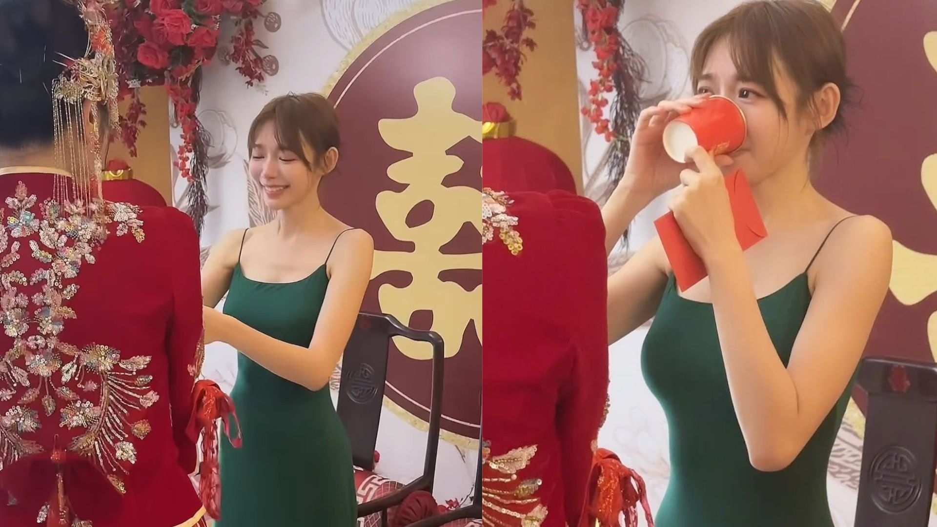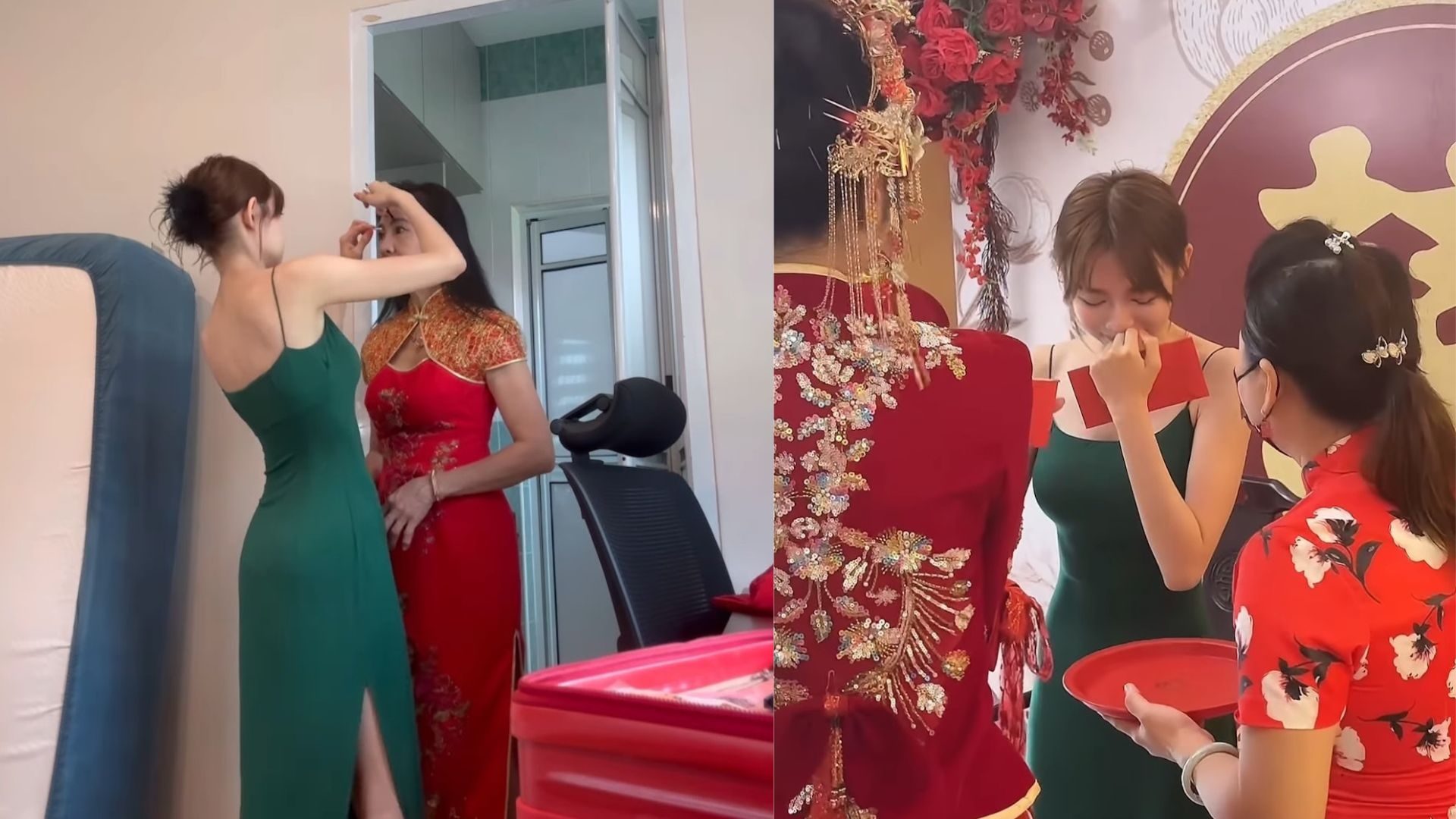 至於林媽媽都好索,穿上紅色開胸設計旗袍。而在明禎親手主理媽媽妝容下,更是明艷照人,艷壓全場。