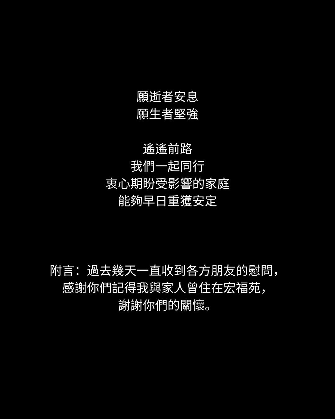 創傷需要時間修復,而我們,願意同行陪伴。家,不只是一磚一瓦,也是絕望中,仍不放棄彼此的一份守望。願逝者安息,願生者堅強,遙遙前路,我們一起同行。衷心期盼受影響的家庭,能夠早日重獲安定。」