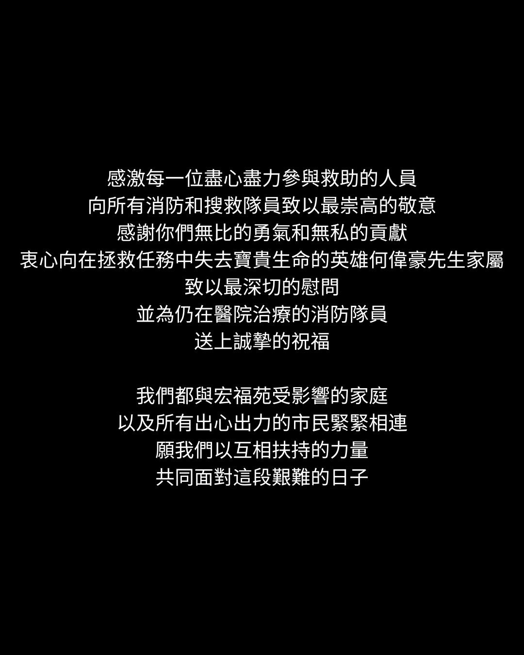 每個舉動、每份心意凝聚起來,都是安頓受創家庭,支撐他們走下去的力量。大火無情家園崩塌,但我們仍可成為彼此的依靠。感激每一位盡心盡力參與救助的人員,向所有消防和搜救隊員致以最崇高的敬意,感謝你們無比的勇氣和無私的貢獻。衷心向在拯救任務中失去寶貴生命的英雄何偉豪先生家屬,致以最深切的慰問;並為仍在醫院治療的消防隊員,送上誠摯的祝福。