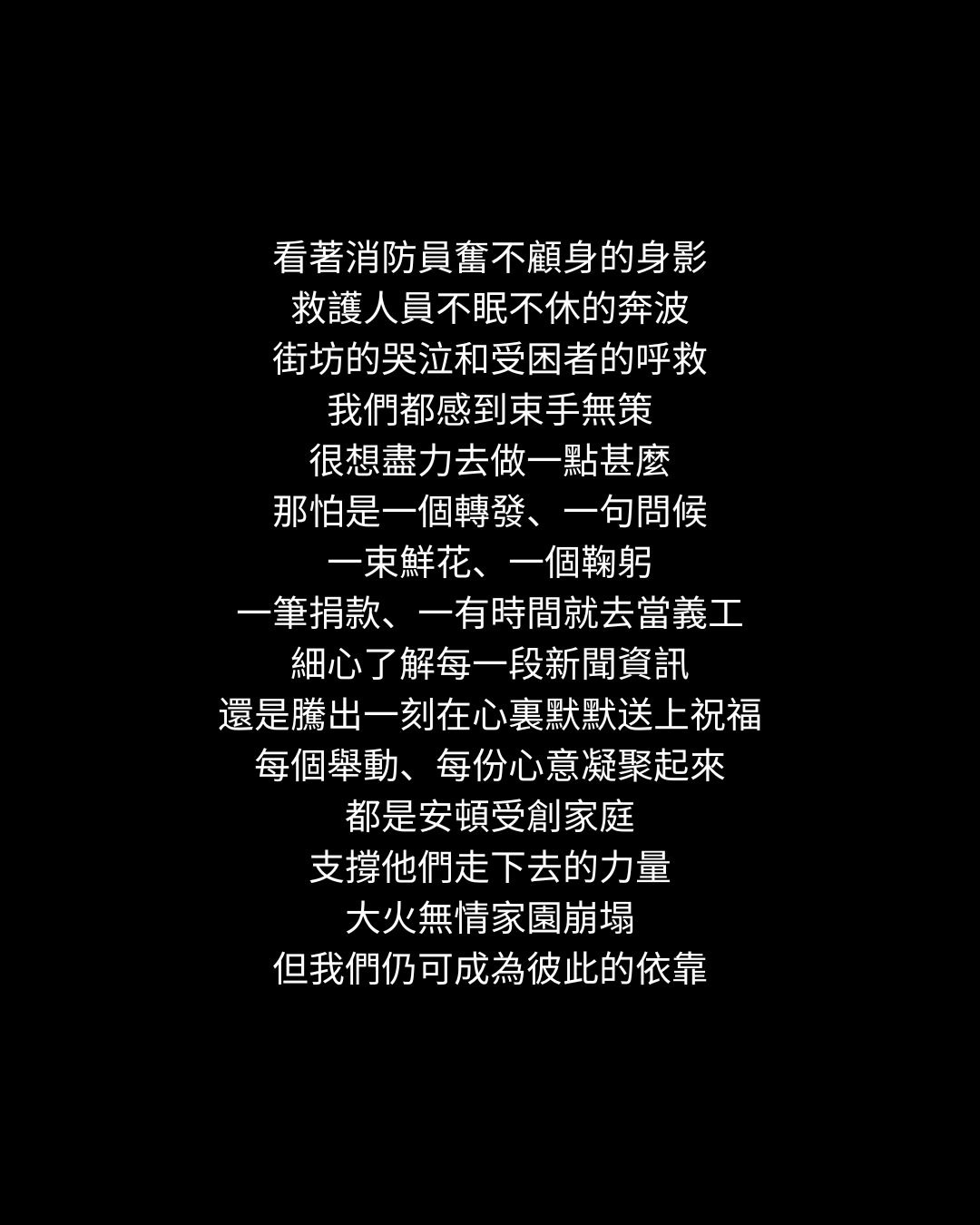 「看著消防員奮不顧身的身影,救護人員不眠不休的奔波,街坊的哭泣和受困者的呼救,我們都感到束手無策,很想盡力去做一點甚麼,那怕是一個轉發、一句問候,一束鮮花、一個鞠躬、一筆捐款、一有時間就去當義工,細心了解每一段新聞資訊,還是騰出一刻在心裏默默送上祝福。