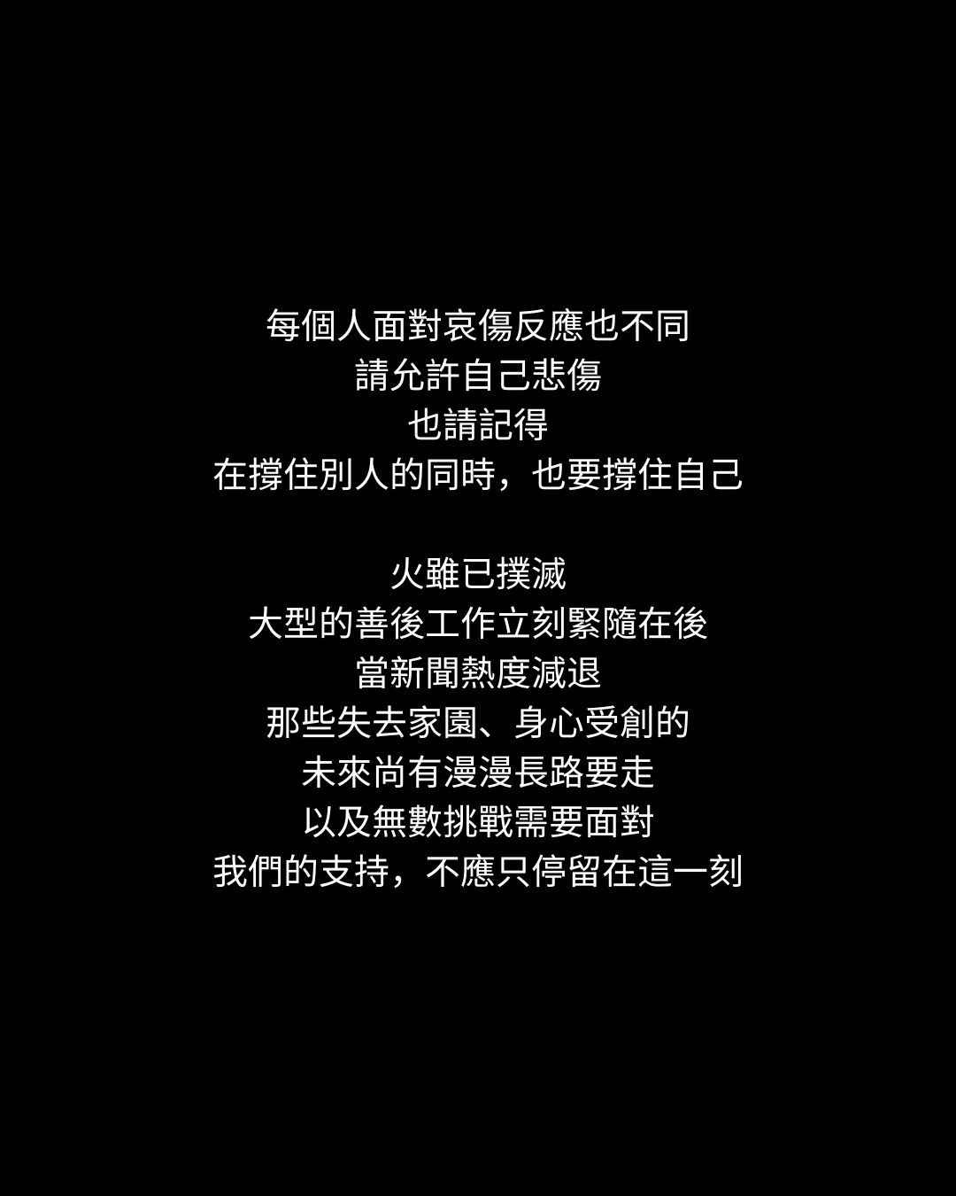 火雖已撲滅,大型的善後工作立刻緊隨在後。當新聞熱度減退,那些失去家園、身心受創的,未來尚有漫漫長路要走,以及無數挑戰需要面對。我們的支持,不應只停留在這一刻,願我們將此刻的傷痛,轉化為長久的承諾。