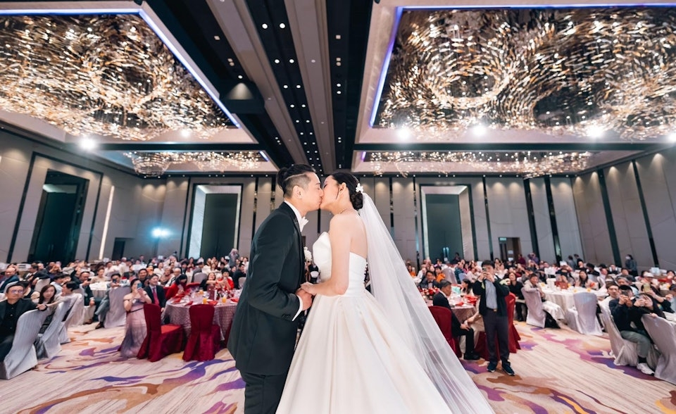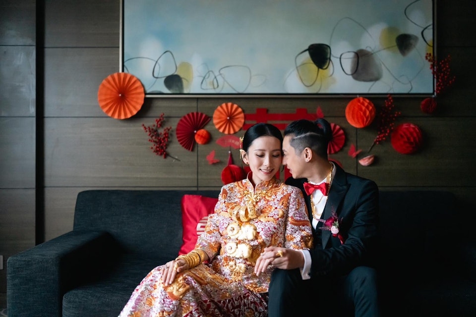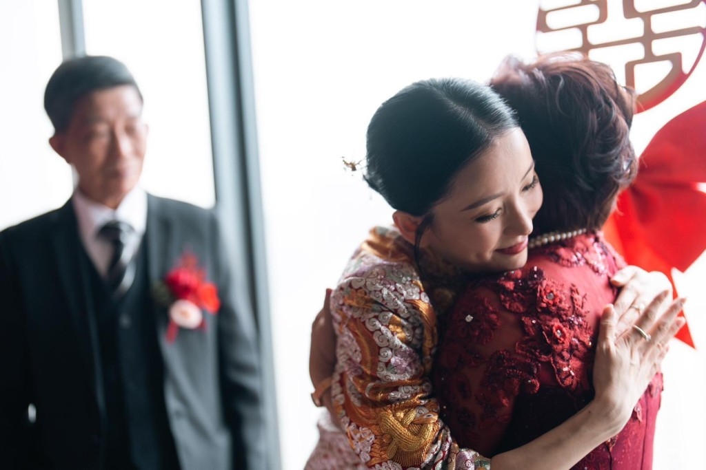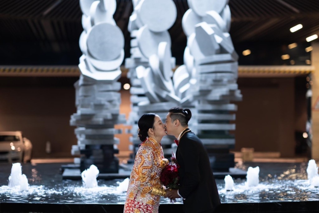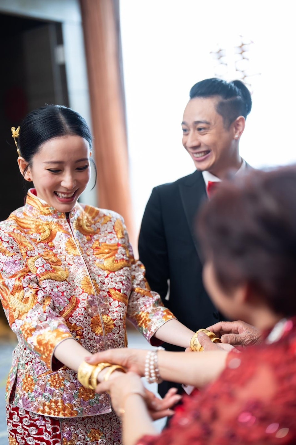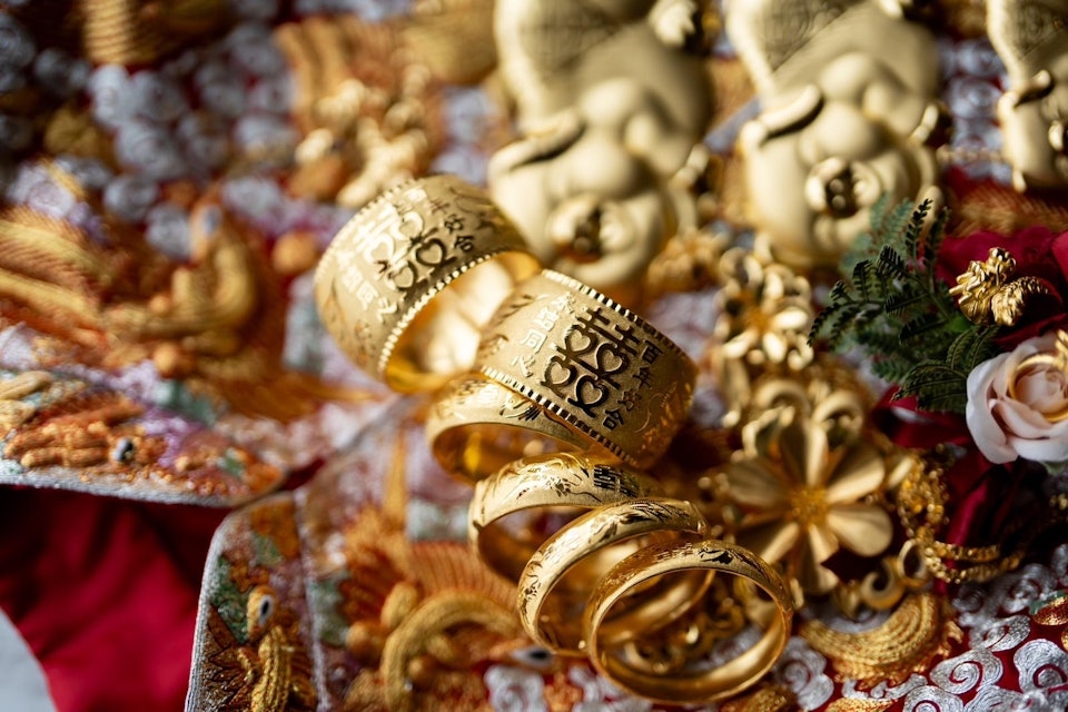 看到Connie發布的婚禮花絮照片所見,一對新人跟足傳統結婚禮節,向長輩們跪地斟茶,最吸睛當然是新娘子穿上金龍金鳳牡丹褂后,滿身戴上雙方家長獲贈的五式金器,包括龍鳳鈪、金豬頸鍊、珍珠頸鏈、手鏈等,貴氣十足。