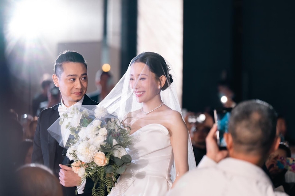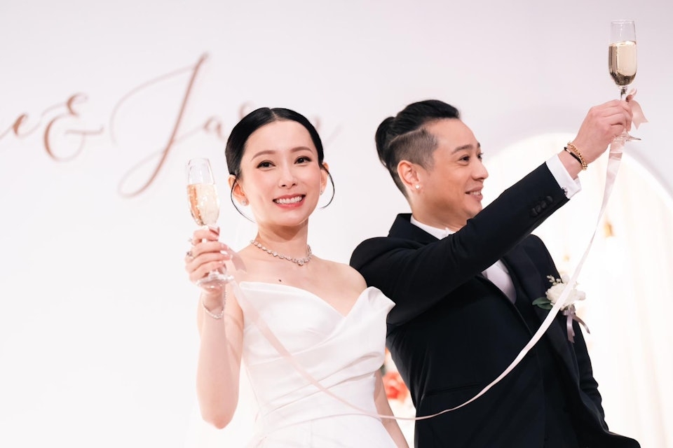 至於新娘哥Jason,就以一套formal tuxedo紳士形象接新娘,由大妗姐陪伴下完成出門入門儀式。再在晚上婚宴的照片中所見,當晚Connie亦宴請了《狀王之王》及《一舞傾城》演員,包括莊思明、陳庭欣、王子涵、利穎怡等圈中好友參加婚宴,看到台上Connie與Jason甜蜜致辭與互動,一同分享喜悅,好感動。