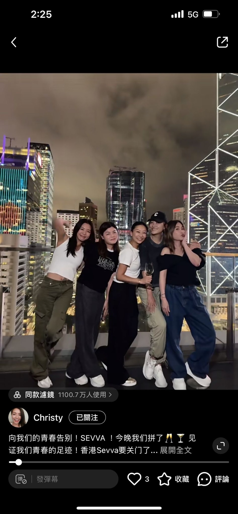 位於中環太子大廈頂層的天台酒吧名人蒲點「SEVVA」,因租約期滿,營業到昨晚光榮結業,結束長達16年的經營。圈中不少名人,都趁最後一日去吃最後晚餐,紛紛打卡作最後道別。