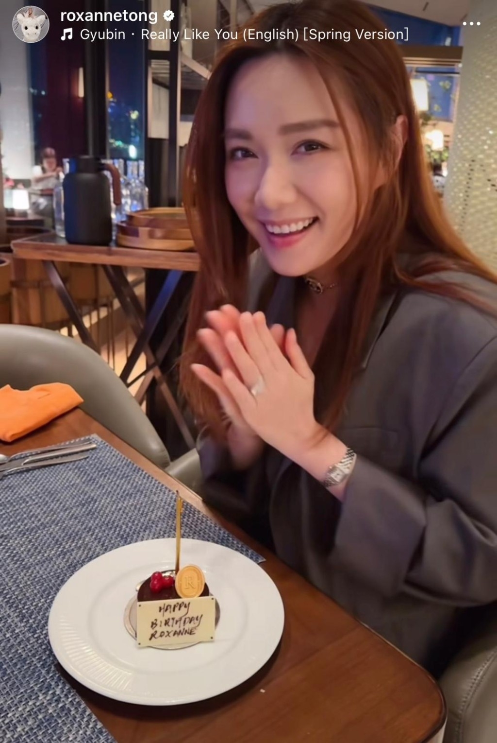 片中截圖所見,二人到了高級餐廳撐枱腳,馬明相當識做,送上靚花束給靚湯,逗得靚湯全場冧爆甜笑,二人對着鏡頭貼頭自拍期間,馬國明更情不自禁表示:「I love you」!雖然片段到了最後二人準備Kiss時就cut了,但壽星女仍甜爆寫上:「他不是一個會給別人驚喜,更不算是一個浪漫的人,但是他就是那一種只要你跟他說過,他便不會忘記嘗試努力做好的另一半,謝謝你為我改變,這已經是最好的生日禮物 @kennethmkm。」