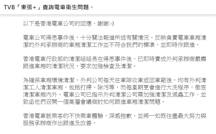 電車公司回覆指,「香港電車行政部的清潔組組長在得悉事件後,已即時責成外判承辦商嚴肅跟進車廂的清潔狀況,要求加強檢查及清潔」。
