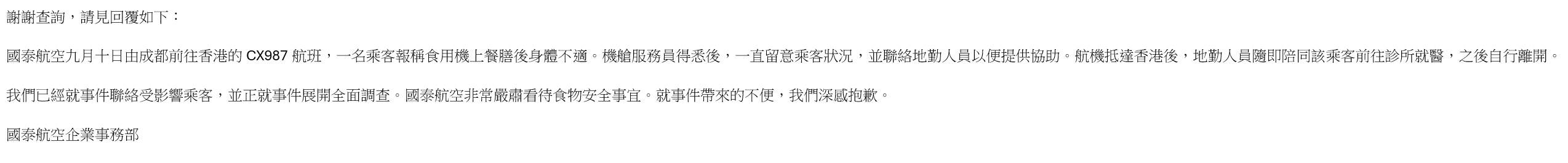 國泰又表示,已經就事件聯絡受影響乘客,並正就事件展開全面調查。國泰航空非常嚴肅看待食物安全事宜。就事件帶來的不便,我們深感抱歉。