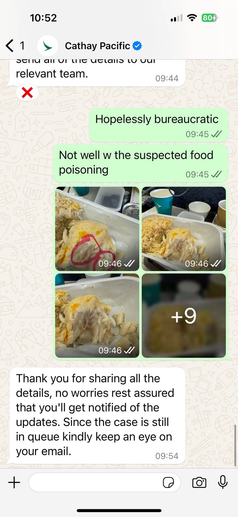 她亦指出,雖然有相片證明自己在機上吃了懷疑未煮熟的魚類,但國泰航空的機艙經理堅持自行檢驗,亦表示未必會將結果告訴謝小姐。她又指出,曾經試過透過國泰航空的WhatsApp聯絡客戶服務專員,但程序極為複雜,亦未能聯絡真人處理事件。