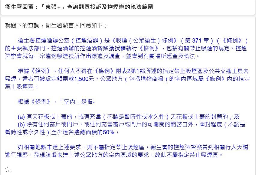 衞生署發言人回覆指,衞生署的控煙酒督察曾到相關行人天橋進行視察,發現該處未達上述公眾地方的室內區域的要求。