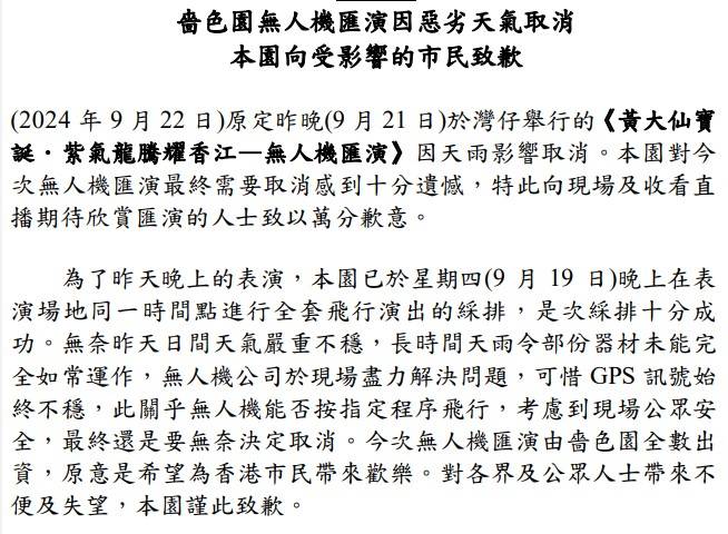 嗇色園解釋,為了昨天晚上的表演,已於星期四(9 月 19 日)晚上在表演場地同一時間點進行全套飛行演出的綵排,當時綵排十分成功。無奈昨天日間天氣嚴重不穩,長時間天雨令部份器材未能完 全如常運作,無人機公司於現場盡力解決問題,可惜 GPS 訊號始終不穩,此關乎無人機能否按指定程序飛行,考慮到現場公眾安全,最終還是要無奈決定取消。