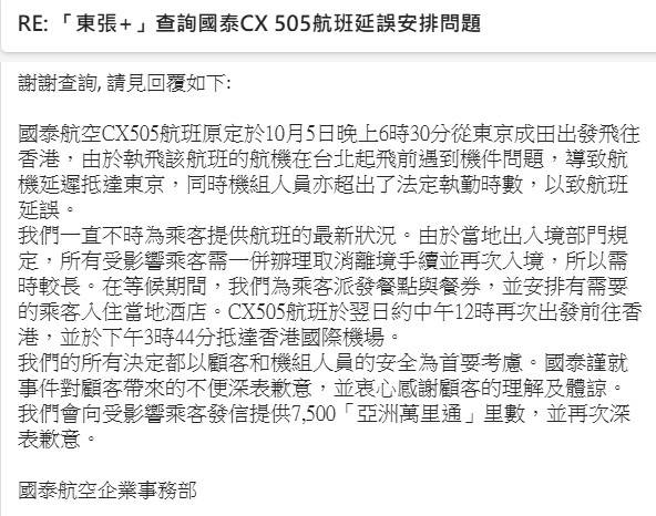 國泰航空CX505航班原定於10月5日晚上6時30分從東京成田出發飛往香港,由於執飛該航班的航機在台北起飛前遇到機件問題,導致航機延遲抵達東京,同時機組人員亦超出了法定執勤時數,以致航班延誤。