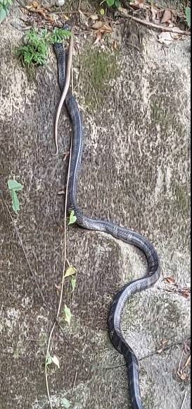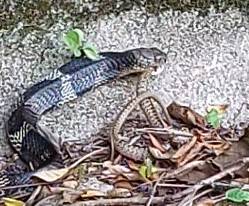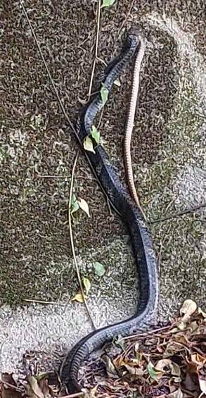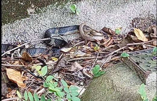 觀眾羅先生上星期三下午約三時,在大埔犁壁山新村路口行前一段斜路,遇到以上恐怖一幕:一條疑似「飯鏟頭」的蛇正咬住另一條較短的蛇!